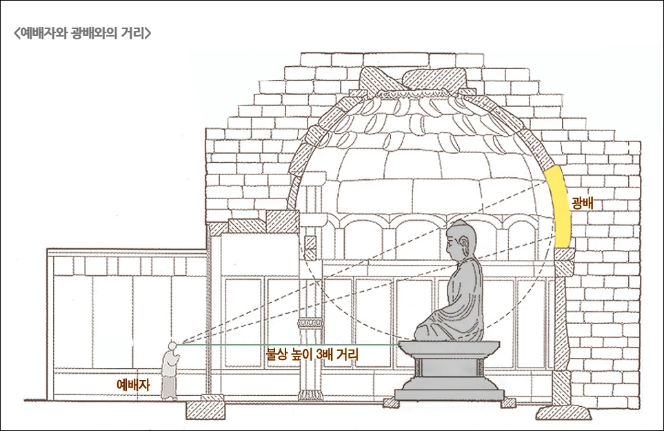 석굴암 석굴의 구조는 입구인 직사각형의 전실(前室)과 원형의 주실(主室)이 복도 역할을 하는 통로로 연결되어 있다. 360여 개의 넓적한 돌로 원형 주실의 천장을 교묘하게 구축한 건축 기법은 세계에 유례가 없는 뛰어난 기술이다.