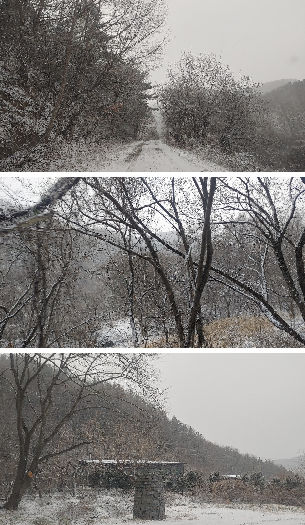 윤동주 시인 유품 및 자료 임시 보관소를 둘러보고 나서니, 그새 내린 눈이 무학산과 산길 위까지 가득 덮고 있다. 아직 눈발이 날리는 산길을 내려오다 보니, 중간에 자동차 바퀴가 서너 번 공회전될 만큼 산길은 벌써 미끄러웠다.