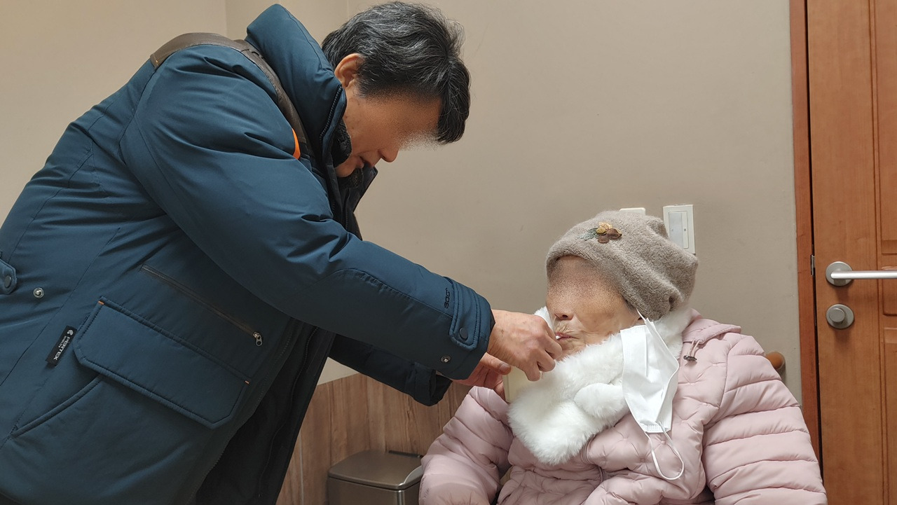 요양보호사 선생님이 둘러준 목도리를 가리키며 '좋다'라고 하시는 등 호불호를 정확하게 드러내신다.