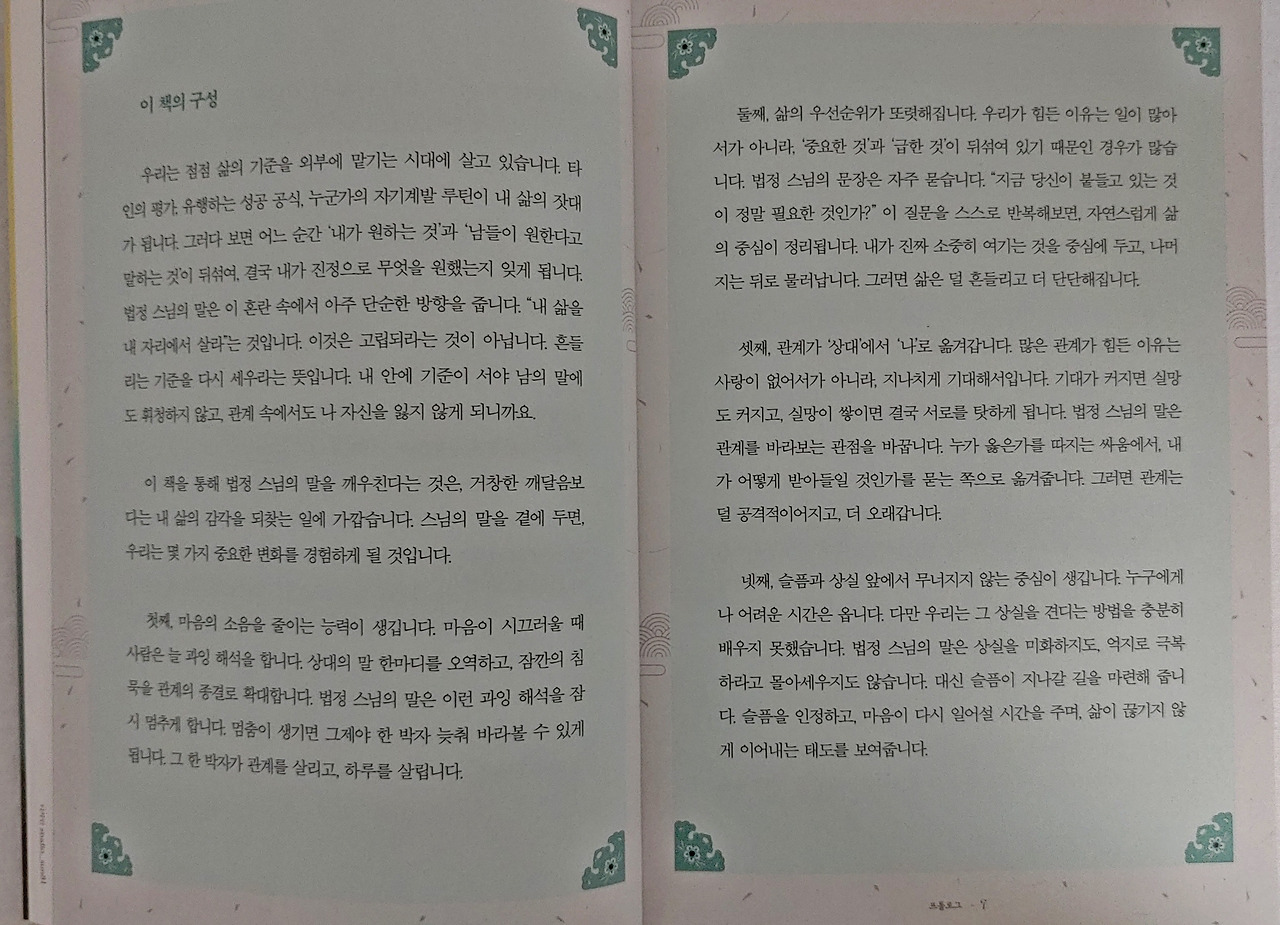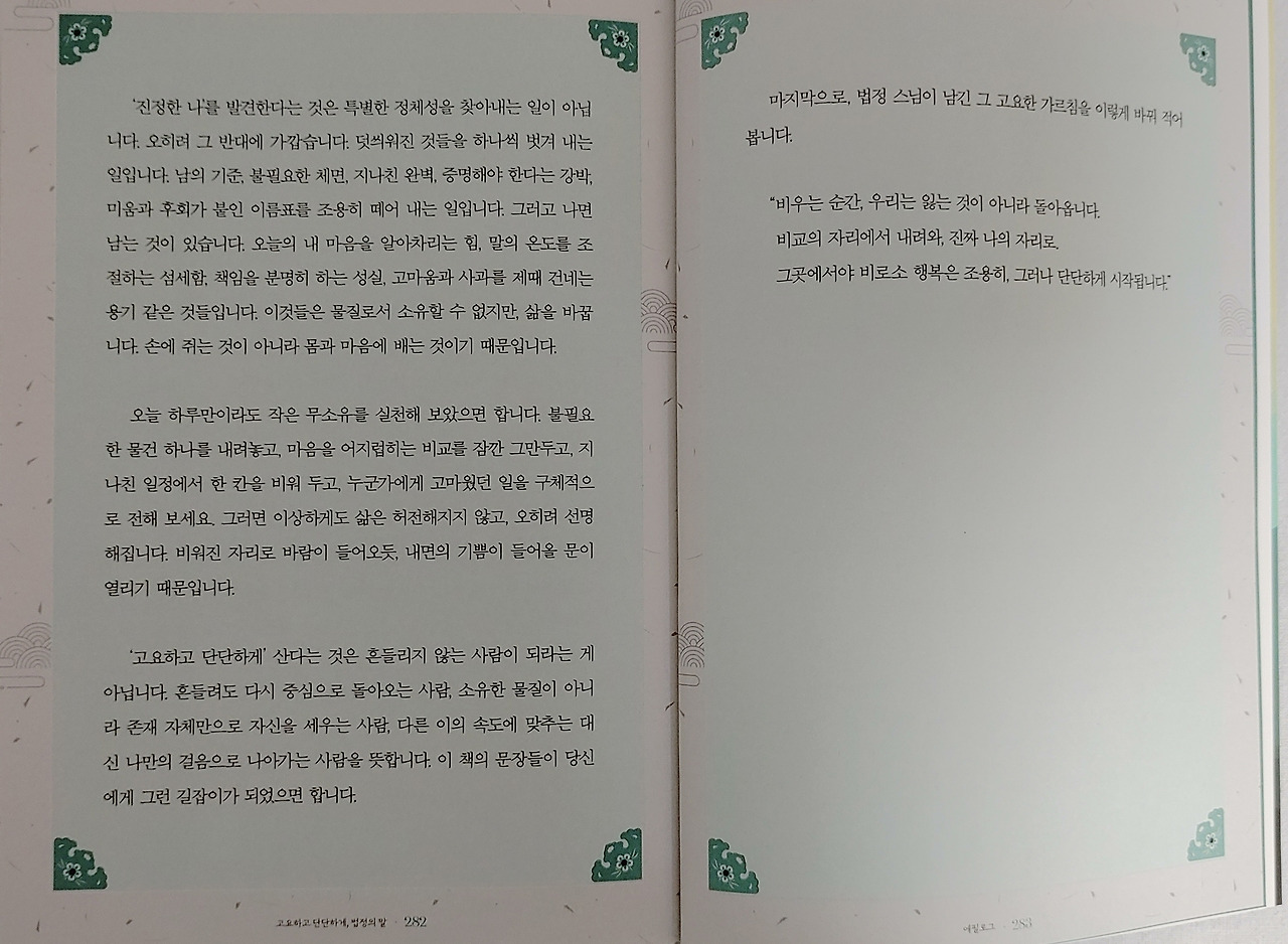법정 스님은 위 짧은 글을 통해, 어제의 나에 얽매이지 말고 '지금 이 순간' 새로운 나를 마주하라 신다. 생명을 지닌 모든 것들은 유한하다. 사람도 꽃도 내일이면 없을 것처럼 치열하고 소중하게 하루를 보내야 하는 이유다. 살아 있음 자체를 당연하게 여기지 말고, 감사의 마음을 세상과 나누라는 스님의 말씀을 담아두고 읽기를 시작한다.