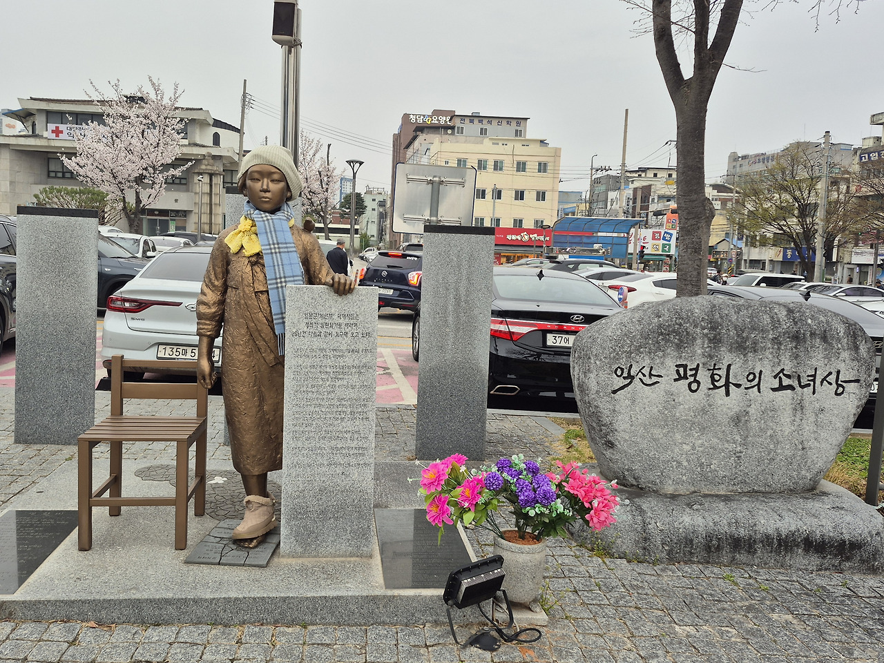소녀상 빈 의자 옆, 바닥에는 평화비가 누워져 있다. 젊은 청년들은 일제에 의해 강제 징집되어 전쟁터로, 그리고 어린 소녀들은 영문도 모른 채 일본군 위안부로 끌러 갔던 역 터였다.