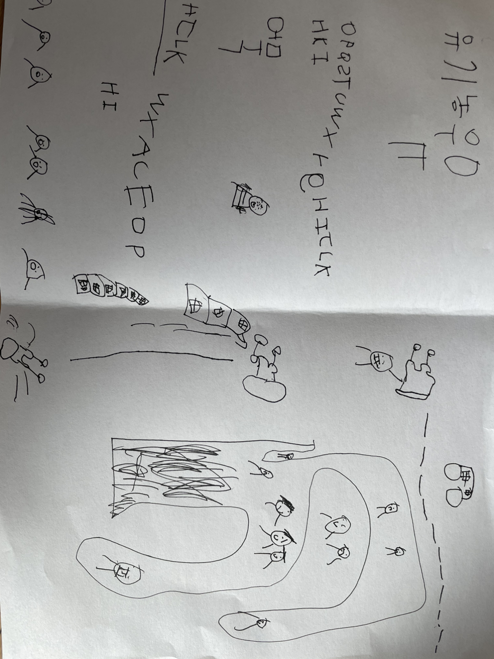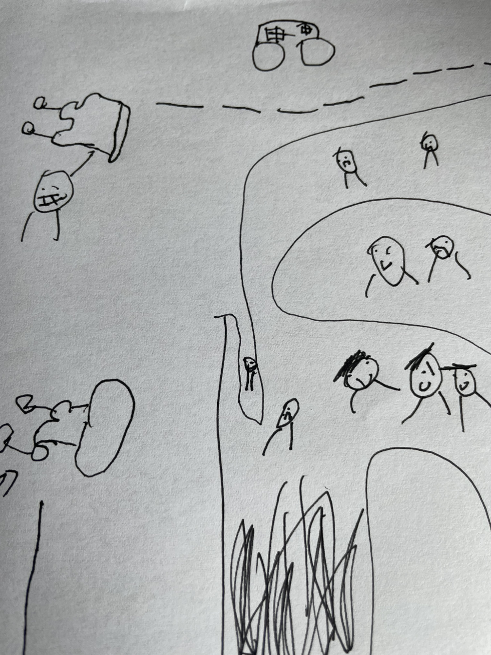 아이가 쓰나미, 지진, 빙하기의 스토리를 아웃풋으로 내놓기 시작했다. 헬리콥터에서 줄이 내려와 사람을 구하는 디테일을 기억하며 아이는 그림을 그리고 이야기를 만들어 냈다.