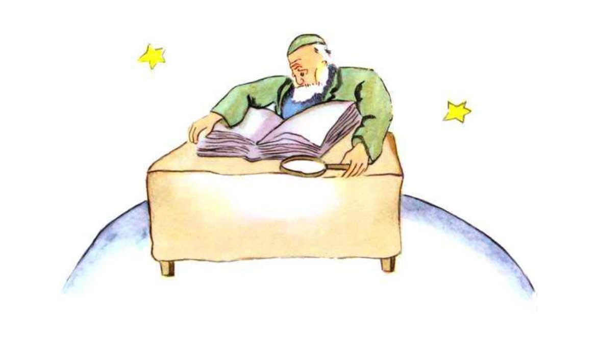 "That's right, " said the geographer, "but I'm not an explorer. There's not one explorer on my planet. A geographer doesn't go out describe cities, rivers, mountians, seas, oceans, and deserts. A geographer is too important to go wandering about. He never leaves his study...."