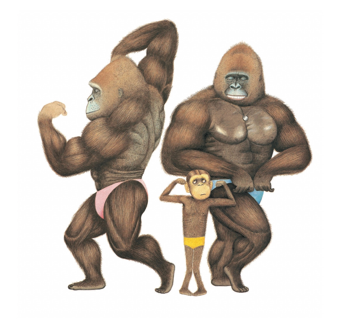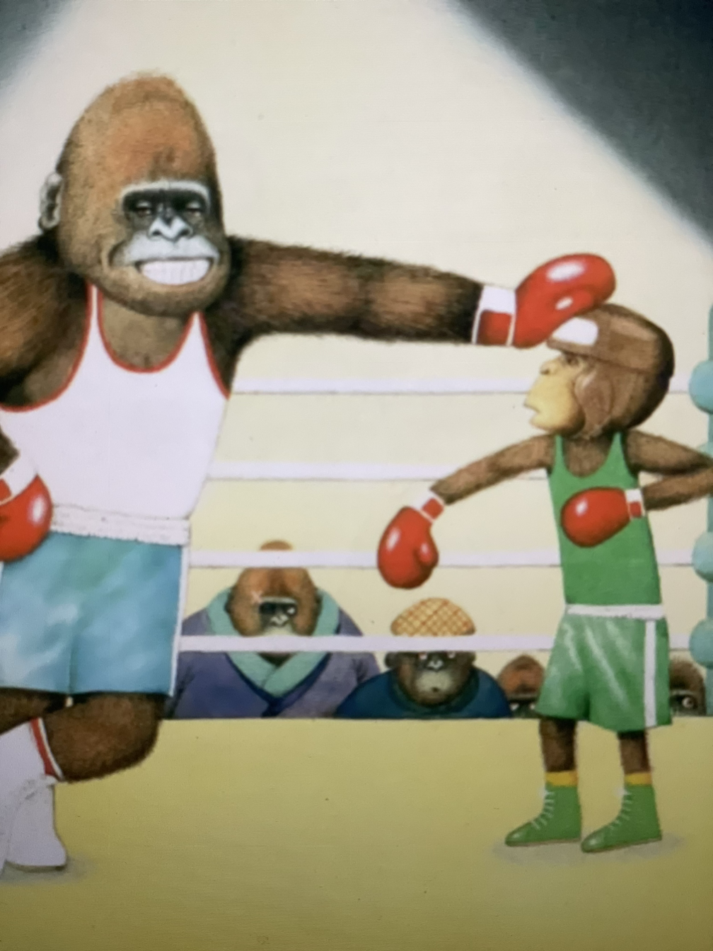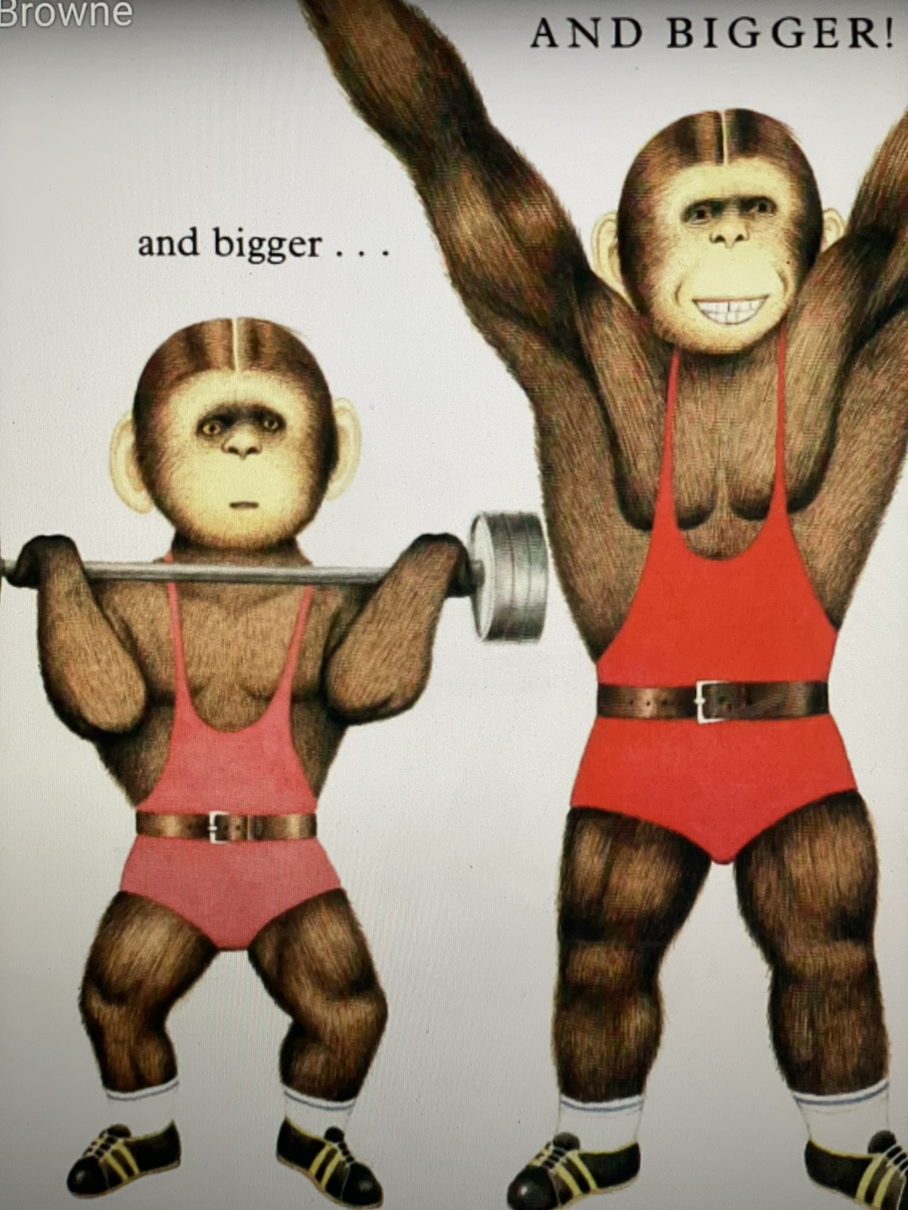 맨체스터 왕립의료원에서 일러스트레이터로 삼 년 정도 일하면서, 수술장면이나 신체의 디테일한 부분들을 그렸던 경험 때문이었을까, 고릴라의 근육미를 과시하는 터치가 남다르다. Anthony 작가가 사랑하는 고릴라 캐릭터. 그는, 고릴라가 가족에게 자상하고 온화하다가 가족이 위험해지면 공격적이 되어 가족을 지키는 아버지를 연상시킨다고 했다. (작가는 아버지의 갑작스러운 죽음을 눈앞에서 바라보며 상당기간 힘들어했고, 그래픽 전공 공부도 전념할 수 없었다고 했다.) 그의 수많은 책에 등장하는 자상하고 사랑스러운 고릴라는... 아버지를 그리워하던 흔적이었을지도.