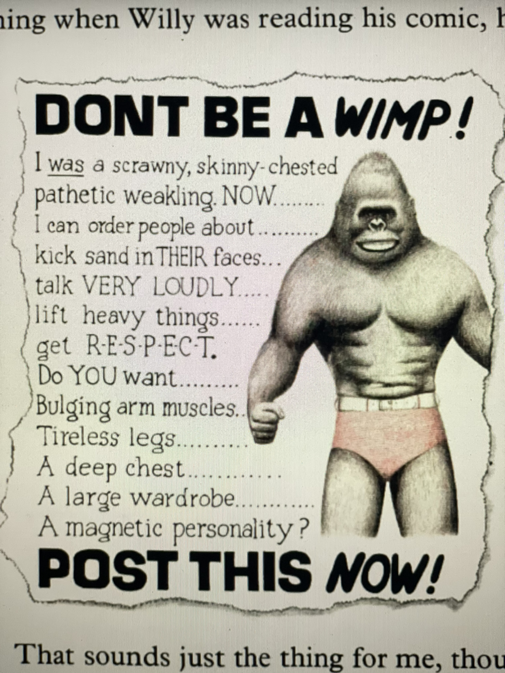 Willy를 괴롭히던 동네 불량배들이 Willy를 Wimp라고 놀린다. 겁쟁이. 약골. 찌질이라 부르며 때리는 녀석들에게, 오히려 미안하다고 사과를 하는 대책 없는 녀석. 그러나, 역시 인생의 해답은 책에 있었다. 만화책이면 어떠랴... 책에 실린 광고 모델처럼 멋지게 되고픈 마음. 더 이상 마음에 들지 않는 별명으로 놀림받고 싶지 않은 마음에, Willy는 변화를 시도한다.