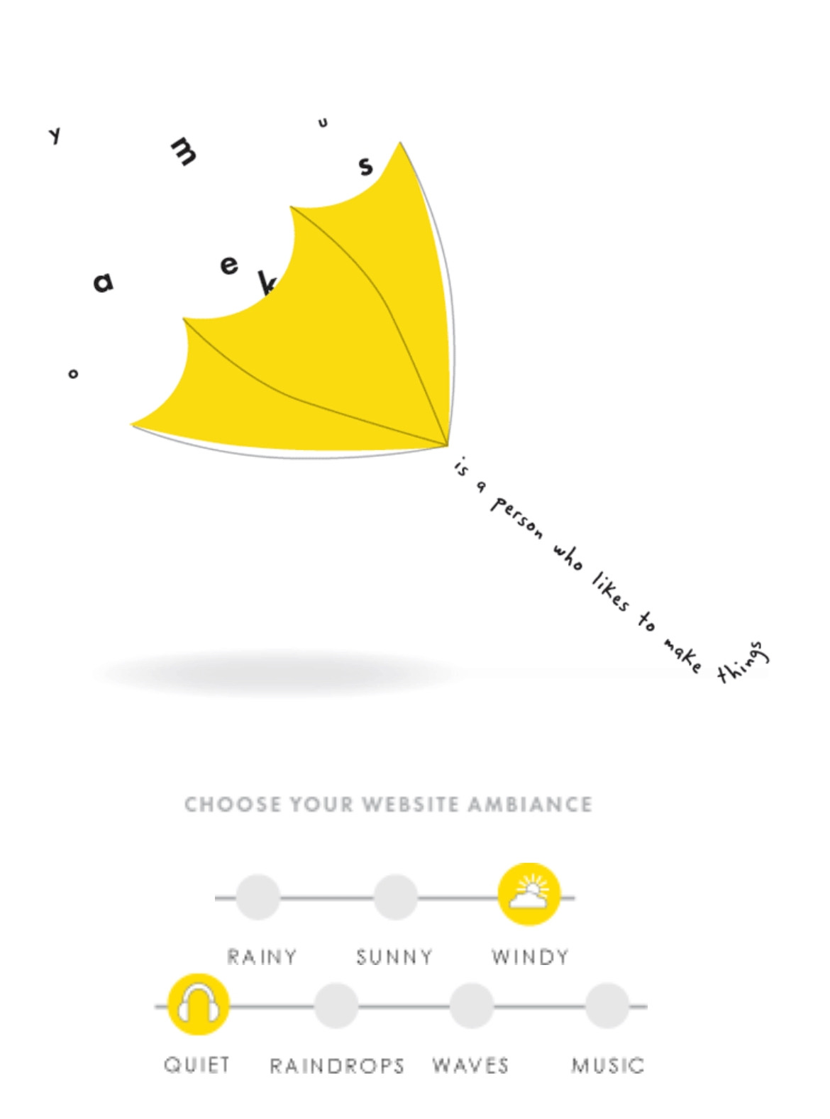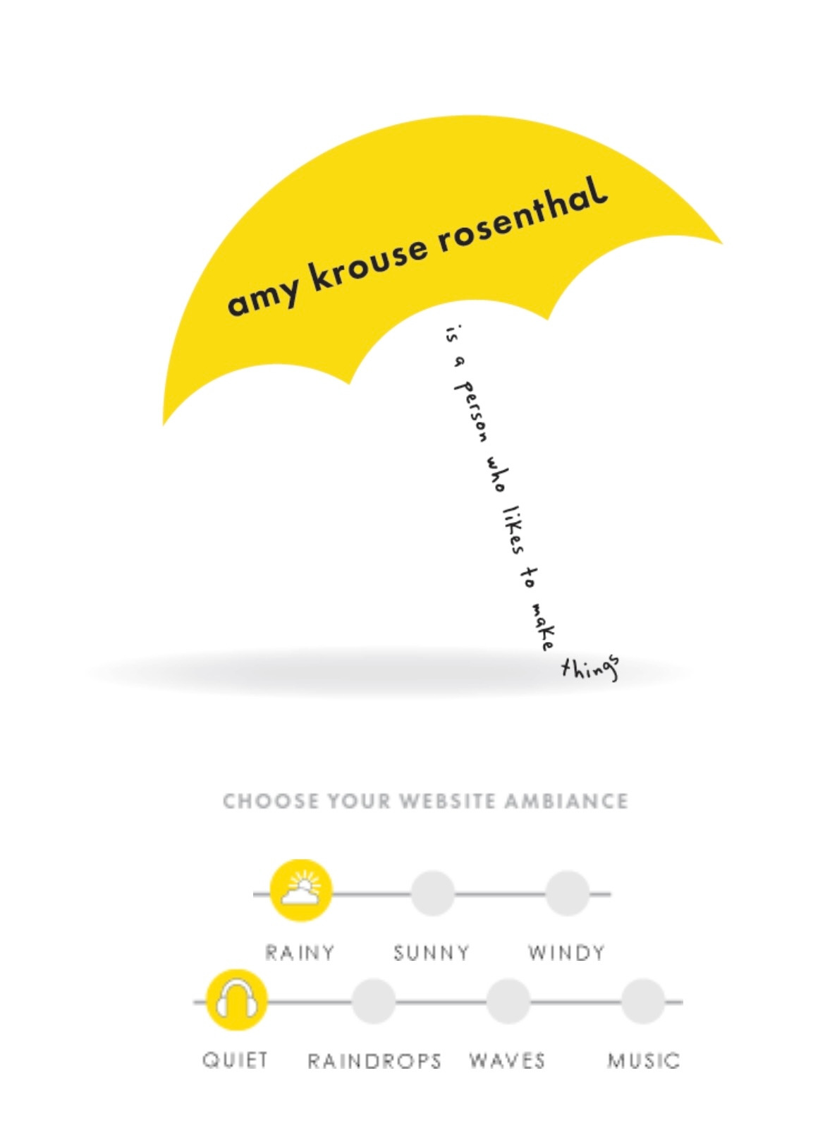 Amy Krouse Rosenthal is a person who likes to make things. 무언가를 만드는 것을 좋아하는 사람. Whoisamy.com 사이트에 가면, 어떤 소리를 들으며 자신의 이야기를 둘러볼지 결정 할 수 있게 되어있다. 이 또한 참신하다. 비 오는 날은 우산이 펴져 있고, 바람 부는 날엔, 우산이 뒤집혀 있다. 노란 우산... 그녀를 오래 기억하게 될 거 같다.