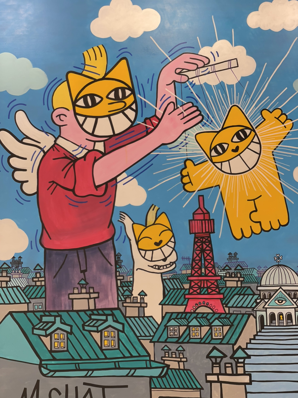 벌금형을 받아가면서도 거리의 예술가로 소통하려던 그의 의지. 멈추지 않는 표현에 대한 응원도 한몫했으리라. 밝고 선명한 배경들이 무슈사의 익살스러움을 증폭시킨다. 해치랑 만나면 둘이서 잘 놀 것 같은 야옹이다.
