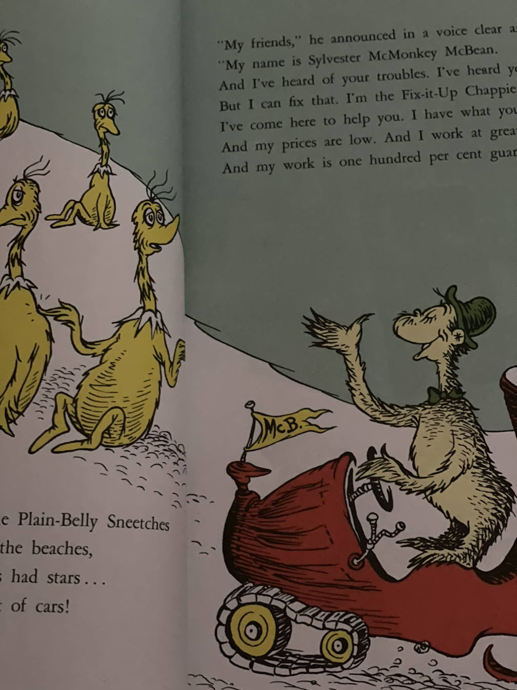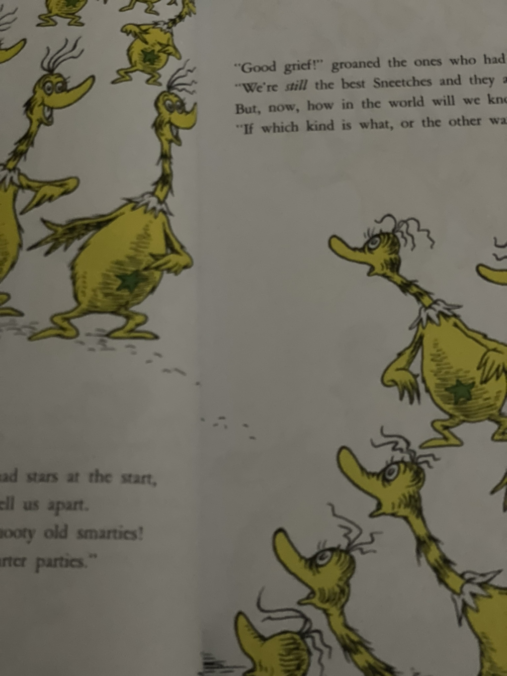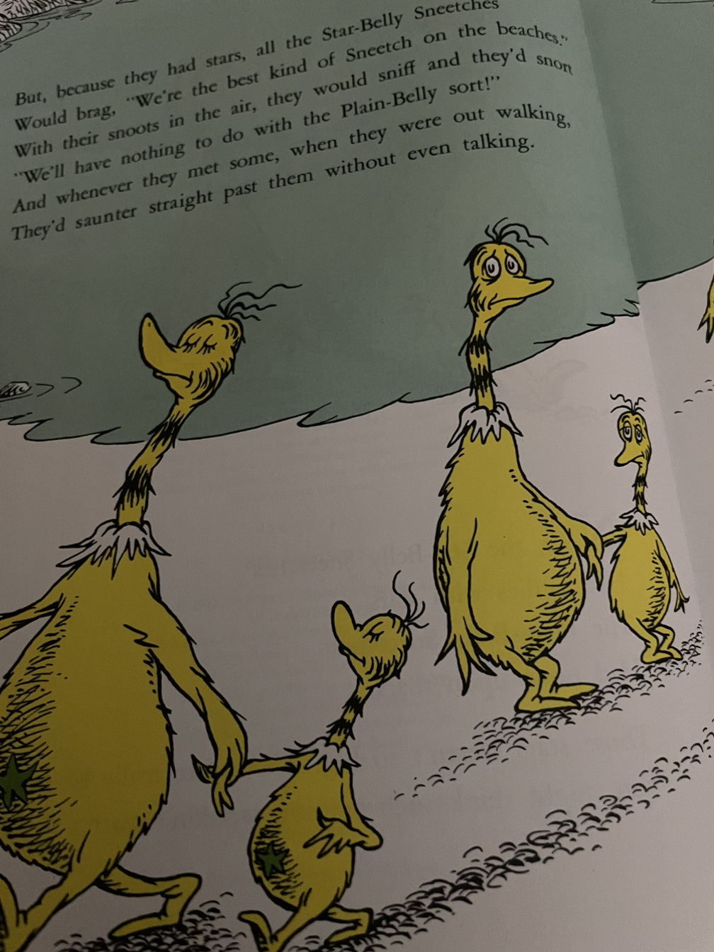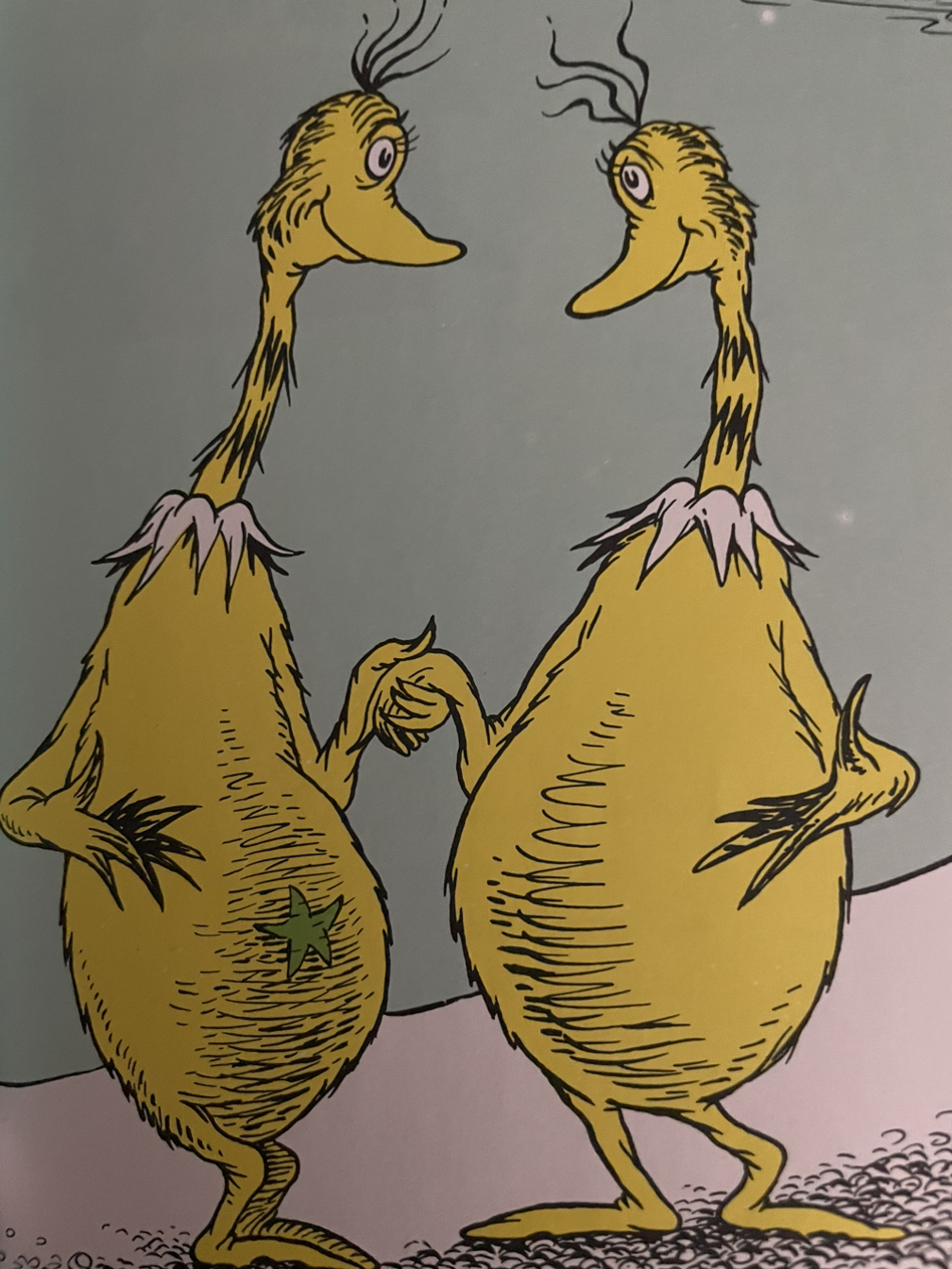 뉴질랜드 키위와 타조를 조화롭게 섞어놓은 듯한 Sneetch 스니치에는 두 종류가 있다. 배에 배꼽처럼 작은 별이 있거나 없거나. 종류가 다양? 한 것까진 괜찮은데, 문제는 별을 달고 있는 측에서 그렇지 못한 그룹에 대해 우월성을 과시하고, 별이 없는 그룹을 게임이나 파티에서 배제시키는 것이었다.