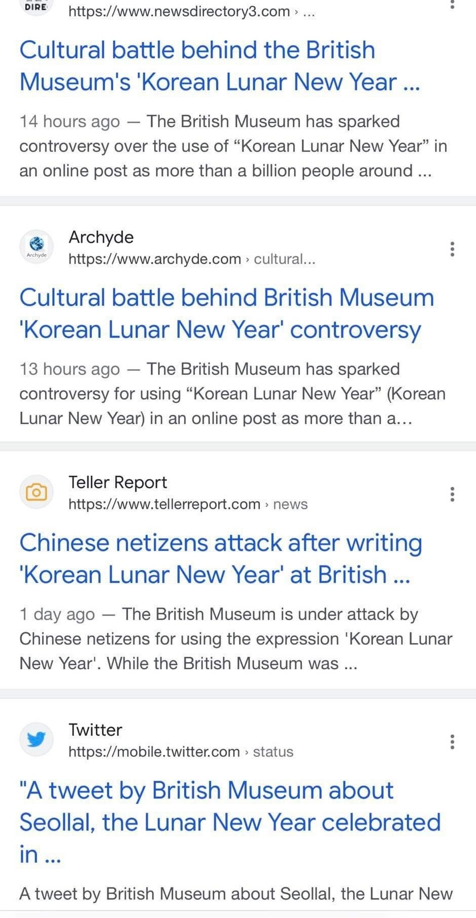 음력설은 중국인들만의 명절이 아니다. 한국이 되었든, 베트남이 되었든, 싱가포르가 되었든... 그 나라의 문화를 소개하는 페스티벌에 그 나라 명칭을 넣는 것이 당연한 것 아닌가 싶은데. 그렇지 않은 사람들의 수가 많아, 그들의 빗발치는 항의에... Sophie 님 말대로라면, 영국 박물관은 한국의 설 행사 포스트를 결국 Chinese Lunar New Year로 표시했다는 얘기인가.