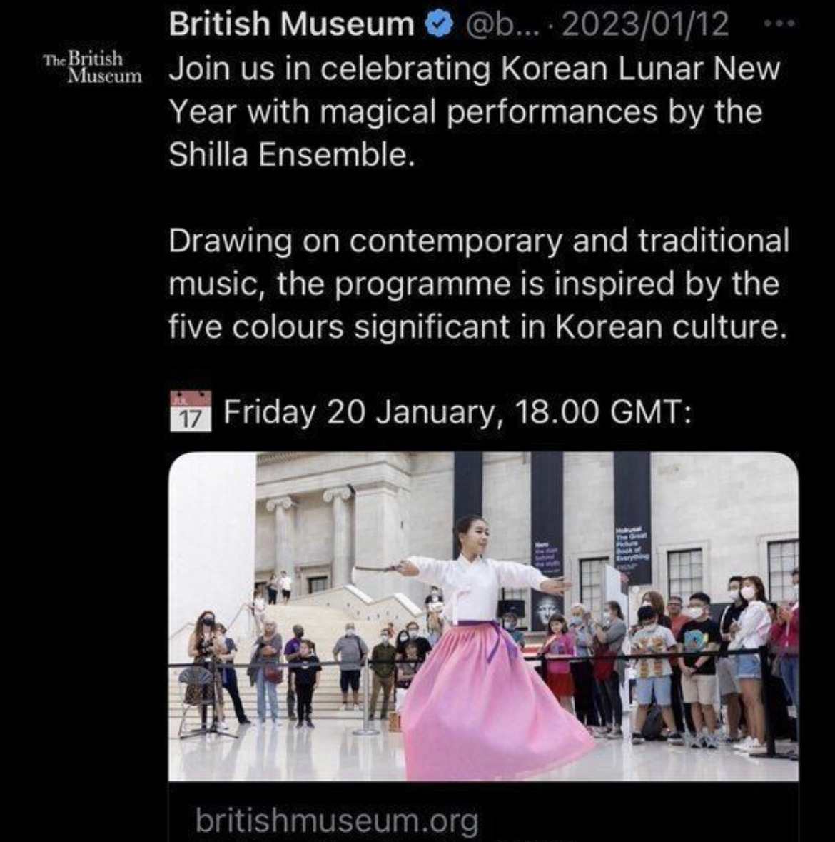 “Join us in celebrating the Korean Lunar New Year and enjoy the magical performance of the Silla Orchestra,” wrote the British Museum’s Twitter account in an event preview posted on January 12.