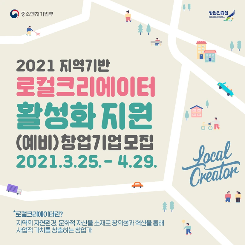 정부 창업 지원 사업들 중 K-Startup(중소벤처기업부와 창업진흥원이 함께 운영하는 정부창업지원 사업 통합 브랜드)의 "2021 지역기반 로컬크리에이터 활성화 지원 (예비) 창업기업 모집"에 대해 알려드림