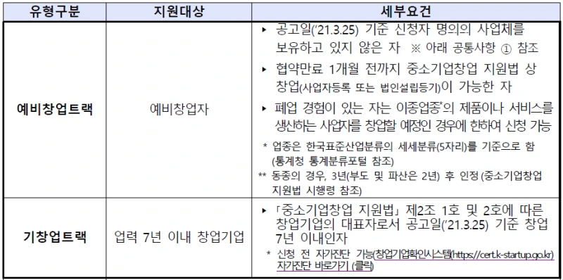 1.예비창업트랙(총 50명) : 사업공고일까지 창업경험이 없거나 사업체를 보유하고 있지 않은 예비창업자 (최대 1천만원)