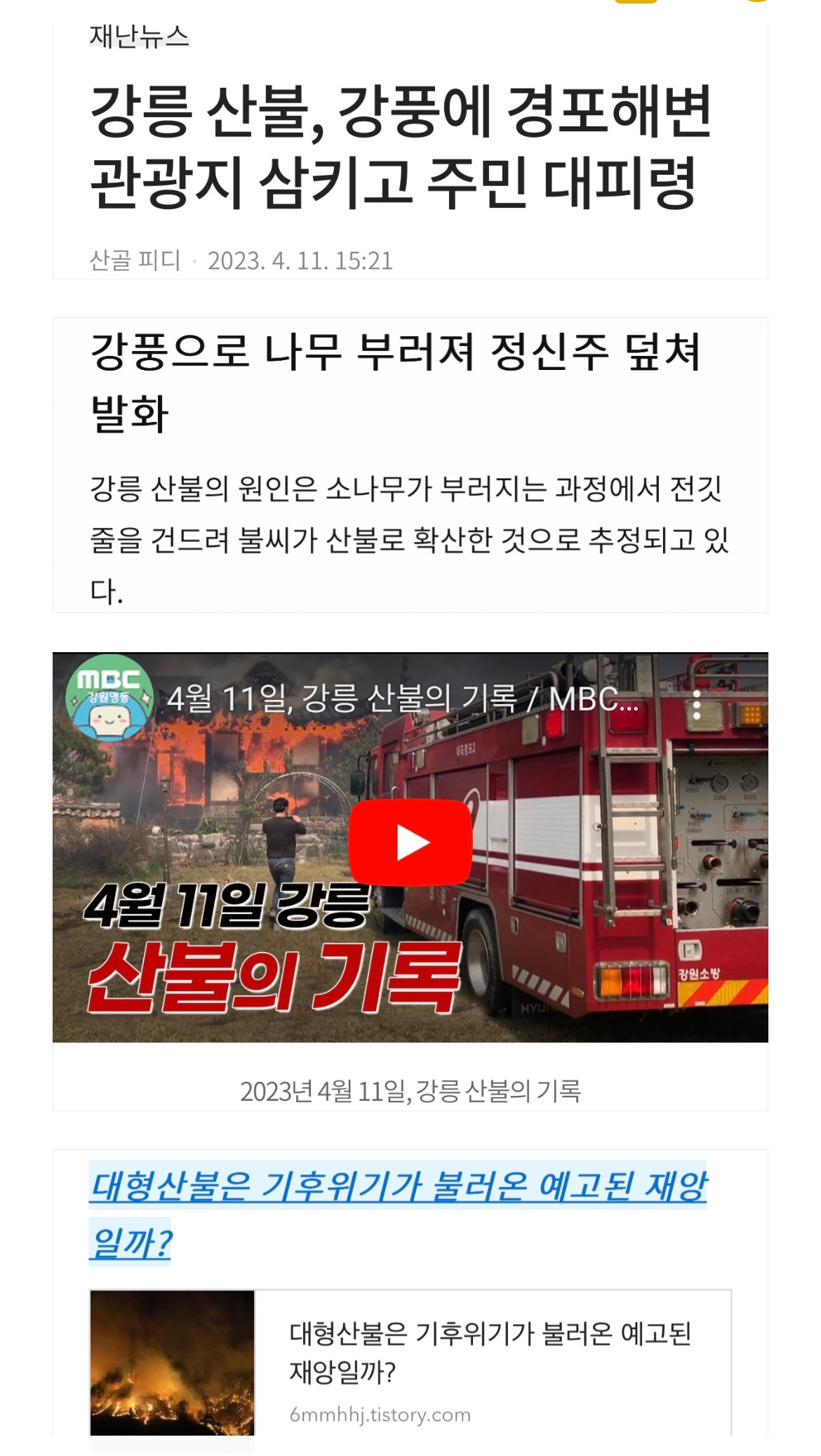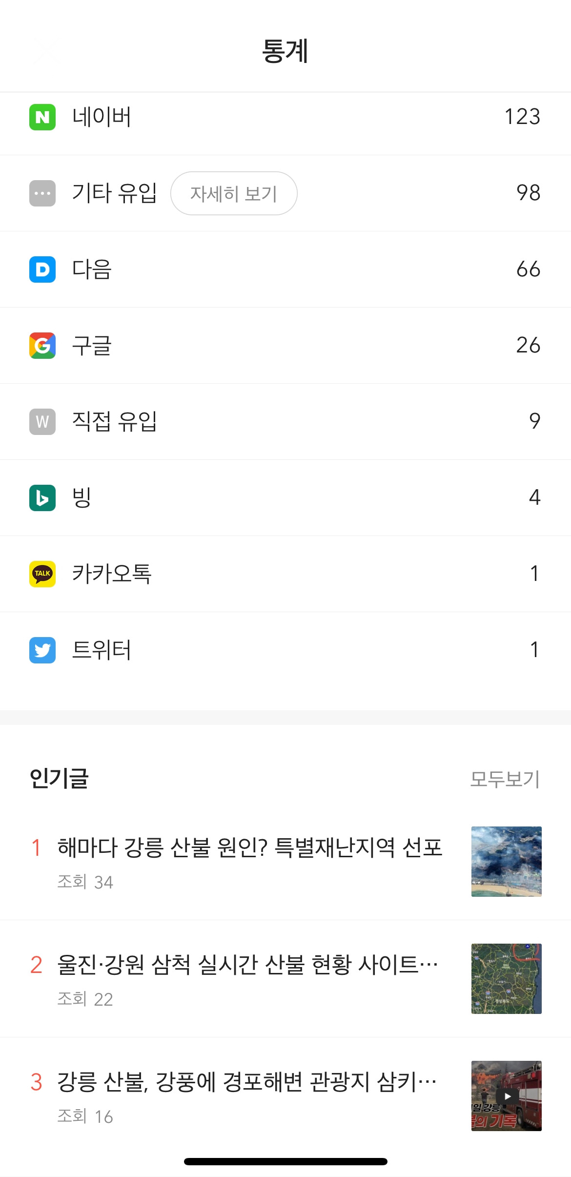 이번 강릉 산불도 지역 시청자들은 TV보다는 스마트폰으로 실시간 산불 소식을 접하니까 #산골피디 티스토리 블로그 https://6mmhhj.tistory.com 페이지에 MBC강원영동 산불 유튜브 링크도 걸어 보니 내 블로그를 통해 들어온 사람들의 검색 유입이 꽤 증가해 MBC강원영동 공식계정 콘텐츠 조회수에 20만이 훌쩍 넘는 도움도 줬다.