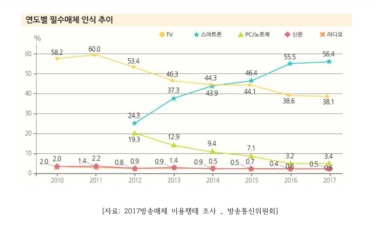 방송콘텐츠 소비의 중심축이 모바일 플랫폼으로 너무나도 빠르게 옮겨갔다. 2010년 이후 스마트폰 중심의 모바일 기기가 콘텐츠 유통과 소비의 핵심 플랫폼이 되었다. 방송콘텐츠 플랫폼이 TV에서 모바일로 이동했기 때문에 2016년을 기점으로 지상파 방송채널에 대한 실시간 시청이 급감하였고, 이는 곧 방송광고의 급감으로 이어졌다.(시청행태 TV 38.1% 모바일 56.4% ) 이러한 급박한 미디어 환경변화의 상황에서 특히 지역 지상파는 새로운 핵심 비즈니스 모델이 도입되지 않는 한, 위기는 지속될 가능성이 높다. 방송시장의 급격한 환경변화는 지역방송의 사회적 입지를 위축시키고 재정적 기반을 위협하고 있지만, 동시에 인터넷과 모바일 기반의 플랫폼과 스마트 미디어는 새로운 콘텐츠 유통의 활로로서 가능성을 부여하고 있다.