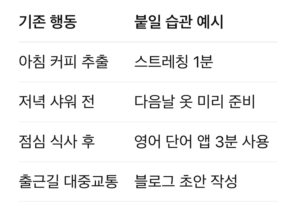이렇게 ‘기존 루틴에 덧붙이는 방식’이 습관 형성 성공률을 3배 이상 높인다는 보고도 있습니다.