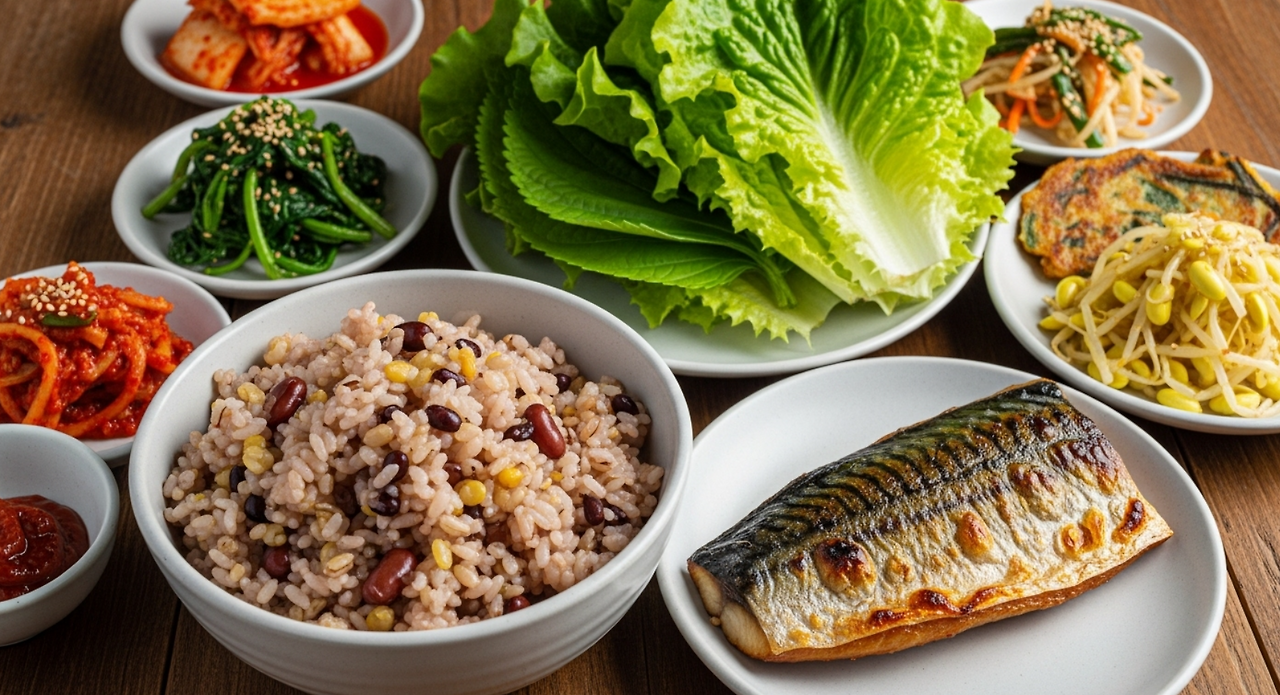 통곡물 콩밥(식이섬유/탄수화물) + 쌈채소 듬뿍(식이섬유) + 구운 고등어 한 토막(단백질/건강한 지방)