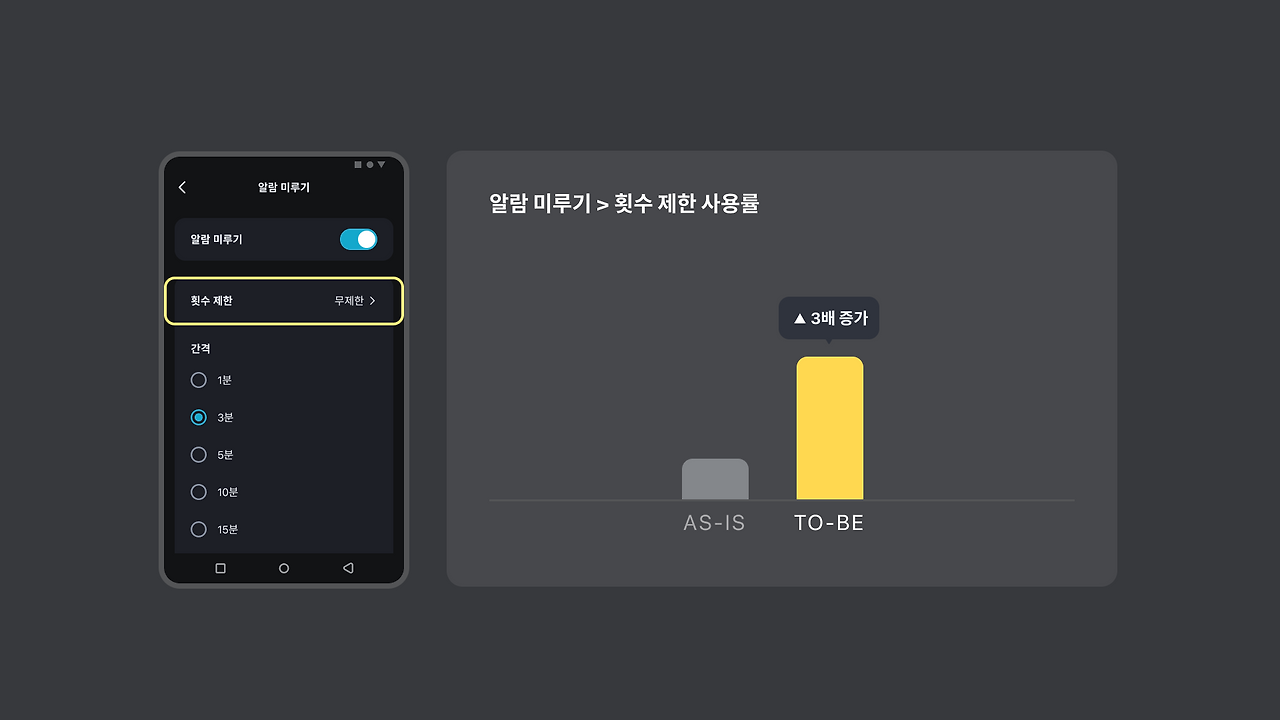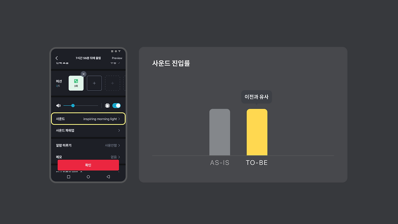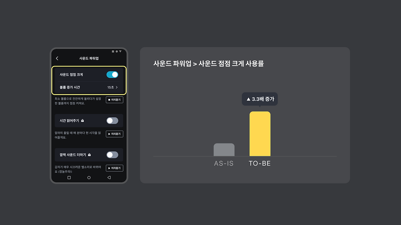 글로벌 설정에 파편화되어 있던 사운드의 커스텀 기능과 알람 미루기의 커스텀 기능들도 3 배이상씩의 사용 증가를 이루었습니다.