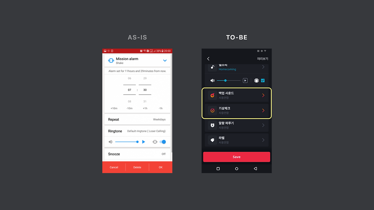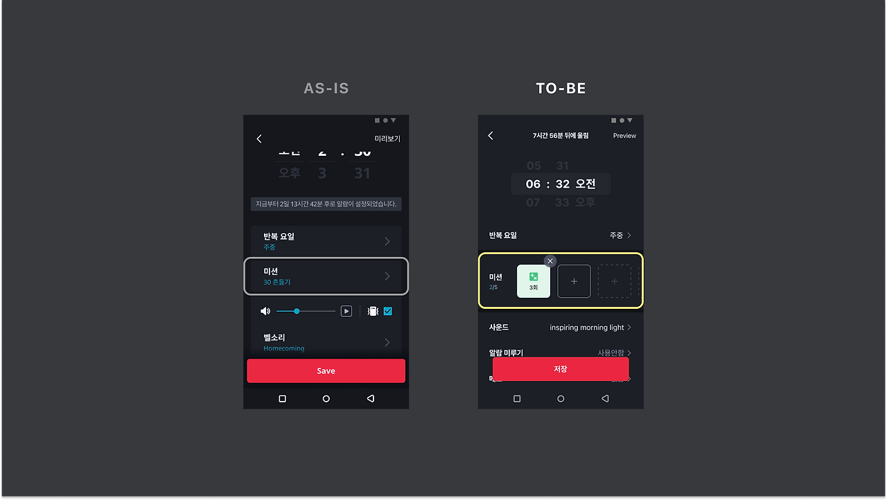 최종적인 목적인 확실한 기상을 위한 알람 설정을 위해 에디터 내 디테일한 목표는 다양하게 변해왔습니다. 변하는 상황에 따라 에디터 화면은 알게 모르게 지속적으로 변해 오고 있었는데요.
