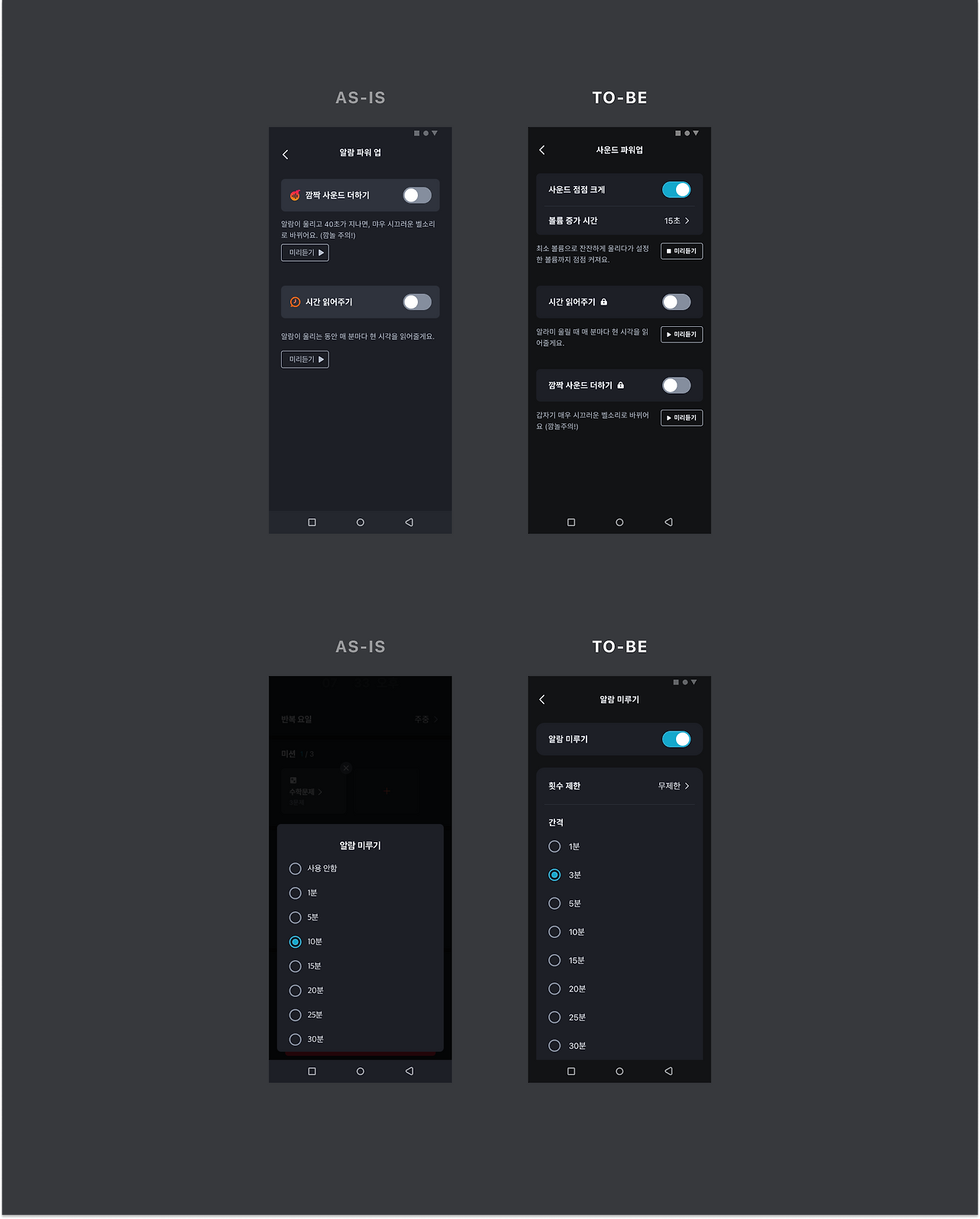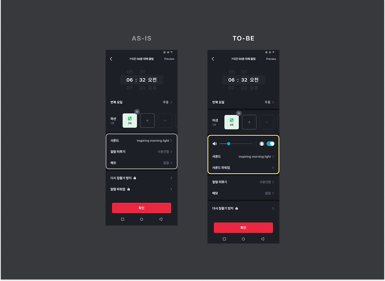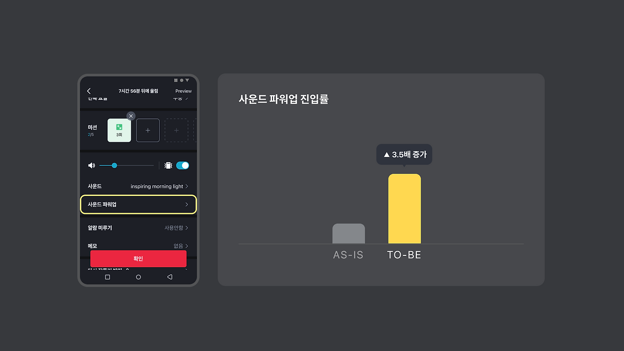 프리미엄 기능 중 알람 파워업 기능은 사운드 기능으로만 구성되어 있었기에 UX Writing을 변경하여 사운드 파워업으로 개선했습니다.