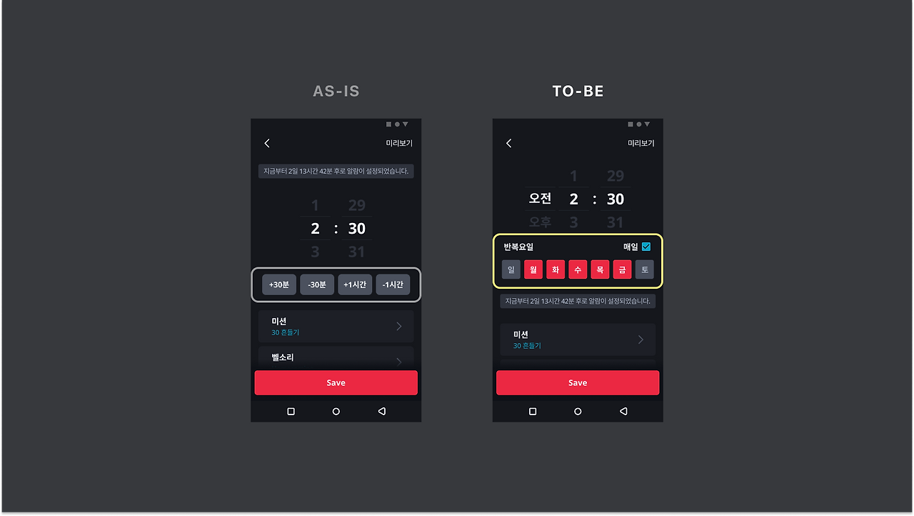 해결방법 : 2댑스에 있던 반복요일 설정의 접근성을 올리는 UI로 개선한다