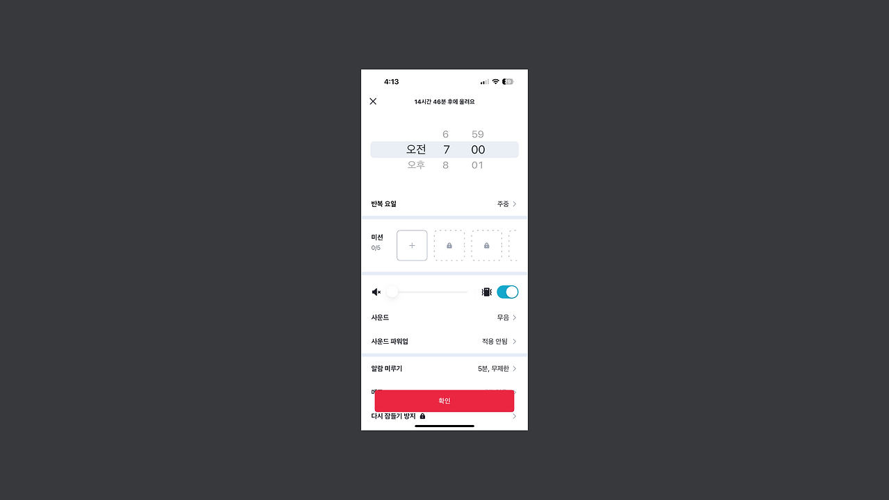 알라미의 알람설정의 가장 핵심인 미션은 오래도록 사랑받아 왔었습니다. 알람설정의 50%의 사용자는 미션을 즐겨 사용했었고 그중 많은 사용자들이 하나의 알람에서 여러 가지 미션을 사용하기 지속적으로 바랬고 알라미팀 또한 여러 가지 미션 사용이 확실한 기상에 큰 도움이 된다고 생각했습니다.