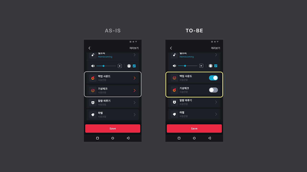이전 알람의 기본적인 기능들끼리 묶여 있던 정보 구조를 사운드는 사운드끼리 모아 정보 구조를 개선했습니다.
