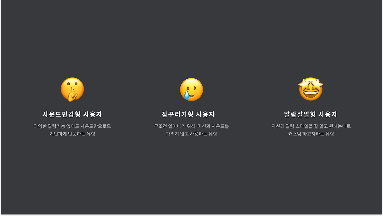 위에 지난 시간 동안 제품 변화에 따라, 전달하고자 하는 목표에 따라 화면은 달라지는데요. 지금의 알람 에디터는 어떨까요? 지금의 알라미는 어떤 방식으로든 어제보다 나은 기상을 성공적인 아침으로 정의하고 있습니다. 그만큼 커버하는 사용자의 유형이 다양해졌음을 보여주는 대목인데요.
