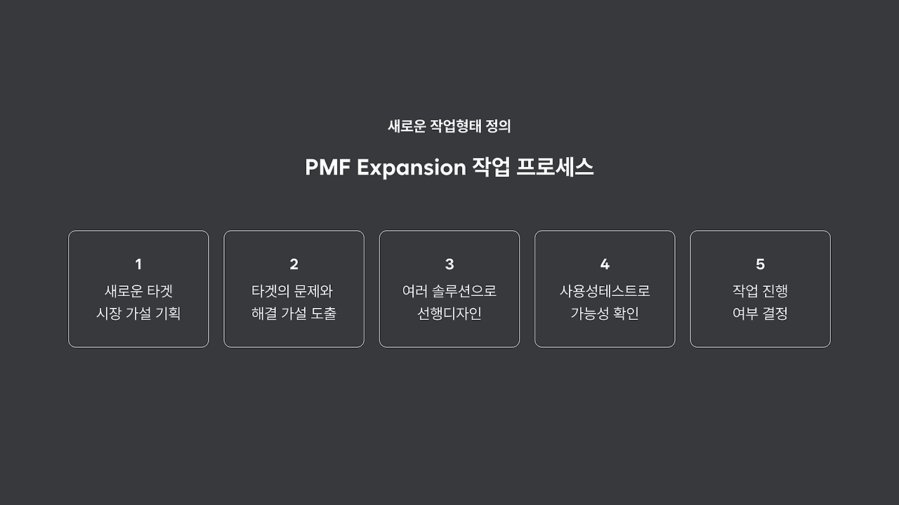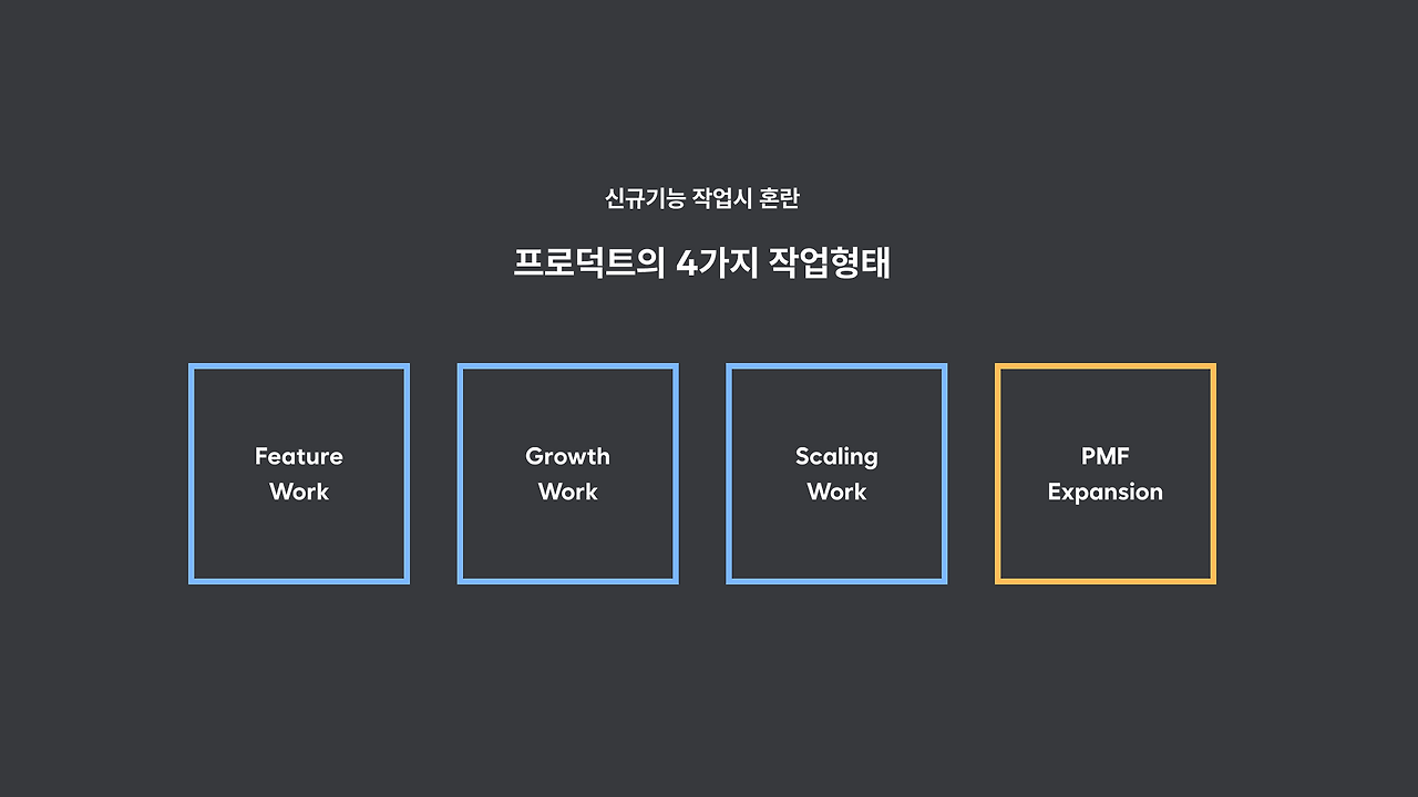 Refoge에 게시되어 있는 이글에서는 어느 제품이든 0 to 1이후 시장의 적합성을 찾고 나서부터는 4가지의 작업 종류로 분류된다고 하였고, 그중 우리가 눈여겨본 부분은 Product Market Fit Expansion 이라는 작업의 형태였습니다. PMF Expansion 이라는 작업의 형태는 이미 안정된 제품이 새로운 시작 확장을 위해 연구하고 검증하는 작업의 종류였고 논의와 검증 그 자체가 작업이었던 새로운 형태의 작업이었습니다. 이 글에서 가장 중요했던 부부는 아래였습니다.
