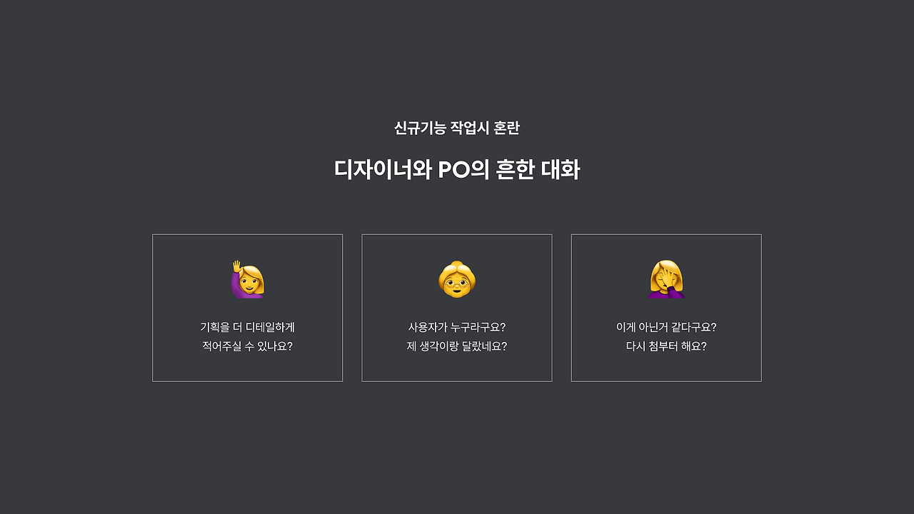 PO의 문제정의가 PBI (Product Backlog Item)으로 등록되면 디자이너와 PO는 기획을 함께 만들어가기 시작합니다. 보통 PO가 문제정의와 솔루션을 제시해 주시면 디자이너는 솔루션을 구현할 구현방법을 PO와 함께 만들어갔었는데요. 늘 순조롭게 진행되었던 구현방법에 대한 기획싱크가 이전과는 달리 PO와 디자이너 사이에 언싱크가 생기기 시작했으며 디자인 프로토타이핑 작업은 예상보다 늘 길어지고 다시 진행되기를 반복했습니다. 여러 번의 신규기능들이 디자인과 사용성테스트를 반복하며 지속적으로 기능 출시를 미루는 결정이 지속되었습니다. 디자이너들은 여러 번 이 과정을 겪다 보니 이상한 점을 느끼기 시작했습니다.