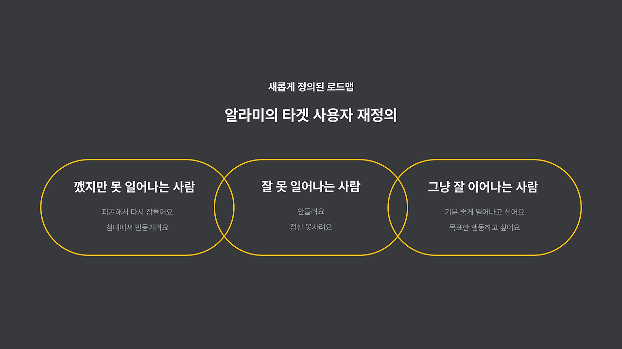 새로운 도메인 확장으로 알라미에서 주요하게 다루는 사용자들의 범위는 넓어졌습니다. 수면 문제를 경험하고 있는 사용자들이 알라미를 통해 잘 자고 잘 일어나는 것에 대해서는 모두 이해하고 있었으나 사용자에 문제상황이나 사용자의 니즈에 대한 구체화에 대해서는 다들 조금씩 다르게 생각하고 있었습니다.