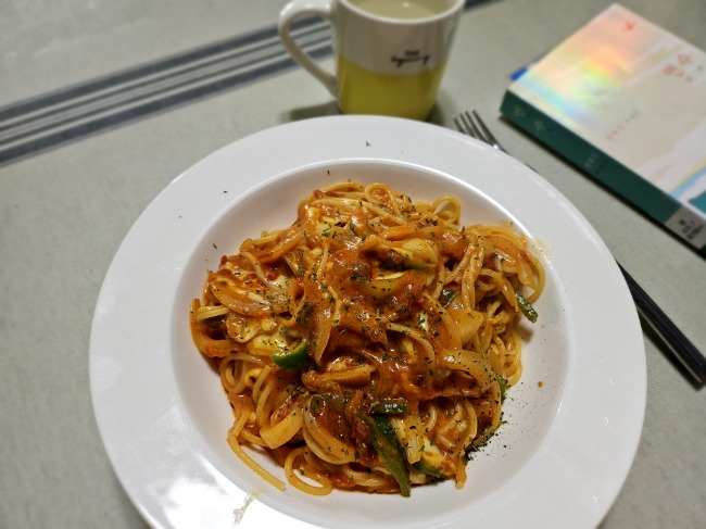 꿀 같은 시간에 내가 먹고 싶은 음식을 내 손으로(그것도 냉장고를 열심히 파서) 만들어 혼자 조용히 먹는 기쁨. 맛있는 스파게티를 먹는 건지, 맛있는 시간을 먹는 건지 모르겠네.