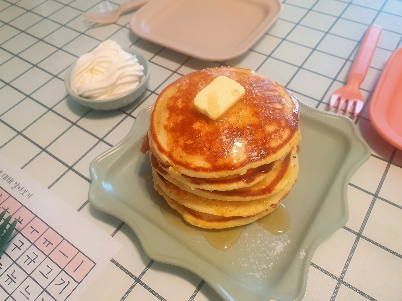 만화에 나왔던 거라면... 잭이 콩나무 타고 올라가서 만난 괴물이 먹던 거 말이지? 층층이 올려진 핫케이크에 네모난 버터 한 조각 놓여있고 시럽 줄줄 흐르는 먹음직스러운 핫케이크? 내적 갈등이 일었다. 속도 시끄러운데 뭔가를 만들기는 너무 귀찮잖아. 근데 또 방학 끝물에 폭신한 핫케이크 한 입 베어 물면 왠지 기분이 좋아질 것도 같고. 아무리 생각해도 번거로운데 마침 집에 온갖 재료가 완벽하게 있는 건 운명인가?