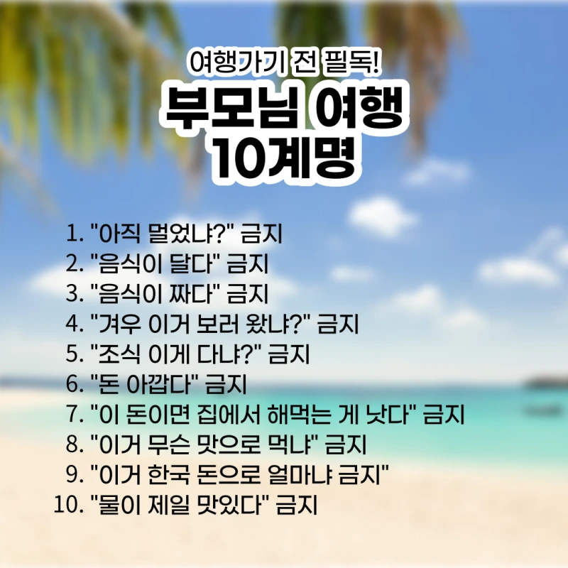'부모님 여행 금지어 10계명'이 나온 게 아주 그냥 이해가 쏙쏙 된다.(사실 '이쯤 되니' 할 것도 없이 이미 이해 쏙쏙이었긴 함.)