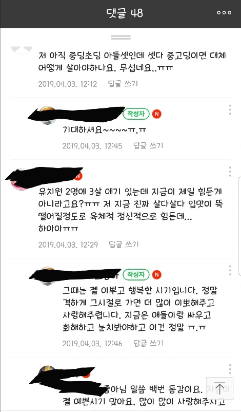 댓글은 더 무서웠다. 비슷한 또래 자녀가 있는 엄마들은 격한 공감을 남겼고, 나처럼 영유아나 초등학생 아이를 키우는 엄마들은 공포에 떨고 있었다. '4학년, 5학년 키우는 중인데, 중고등학교 가면 말 통하고 좀 나아지겠지 했거든요. 이게 무슨 소립니까!' 하는 댓글에는, '부디 지금 많이 행복하세요.'라는 글쓴이의 답변이 달려있었다.