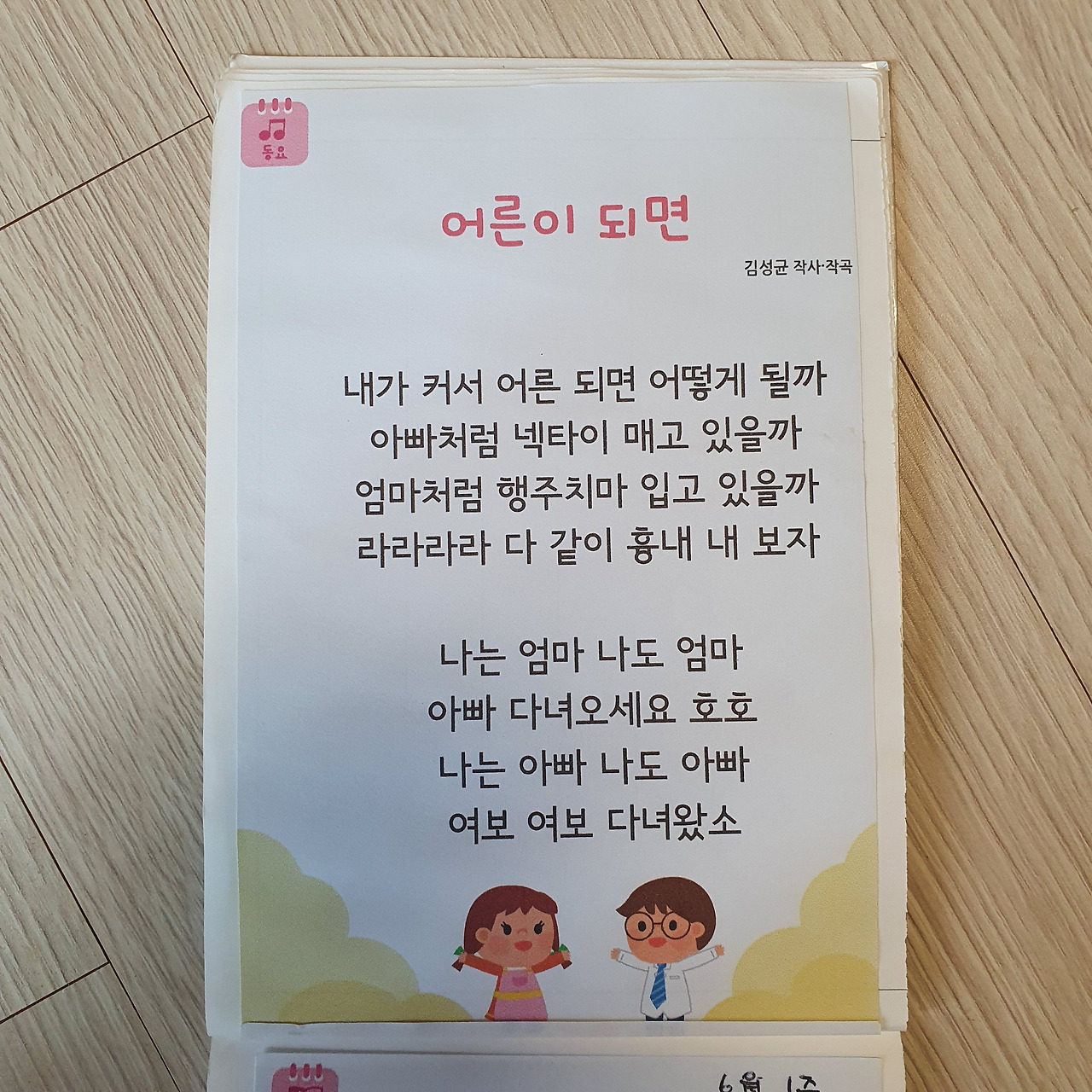 제목: 어른이 되면 내가 커서 어른 되면 어떻게 될까 아빠처럼 넥타이 매고 있을까 엄마처럼 행주치마 입고 있을까 라라라라 다 같이 흉내 내 보자 나는 엄마 나도 엄마 아빠 다녀오세요 호호 나는 아빠 나도 아빠 여보 여보 다녀왔소