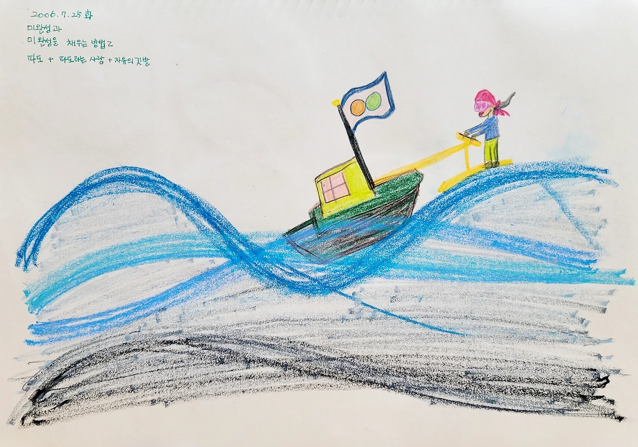 미술치료가 좋은 이유가 여러 가지 있다. 그중에서 자주 확인하는 장점은 고스란히 남는다는 점이다. 20년 가까이 지났지만 이 그림을 그리던 장면, 감정, 생각이 바로 떠오른다. 몇 안 되는 '즐거운 순간'이었다.