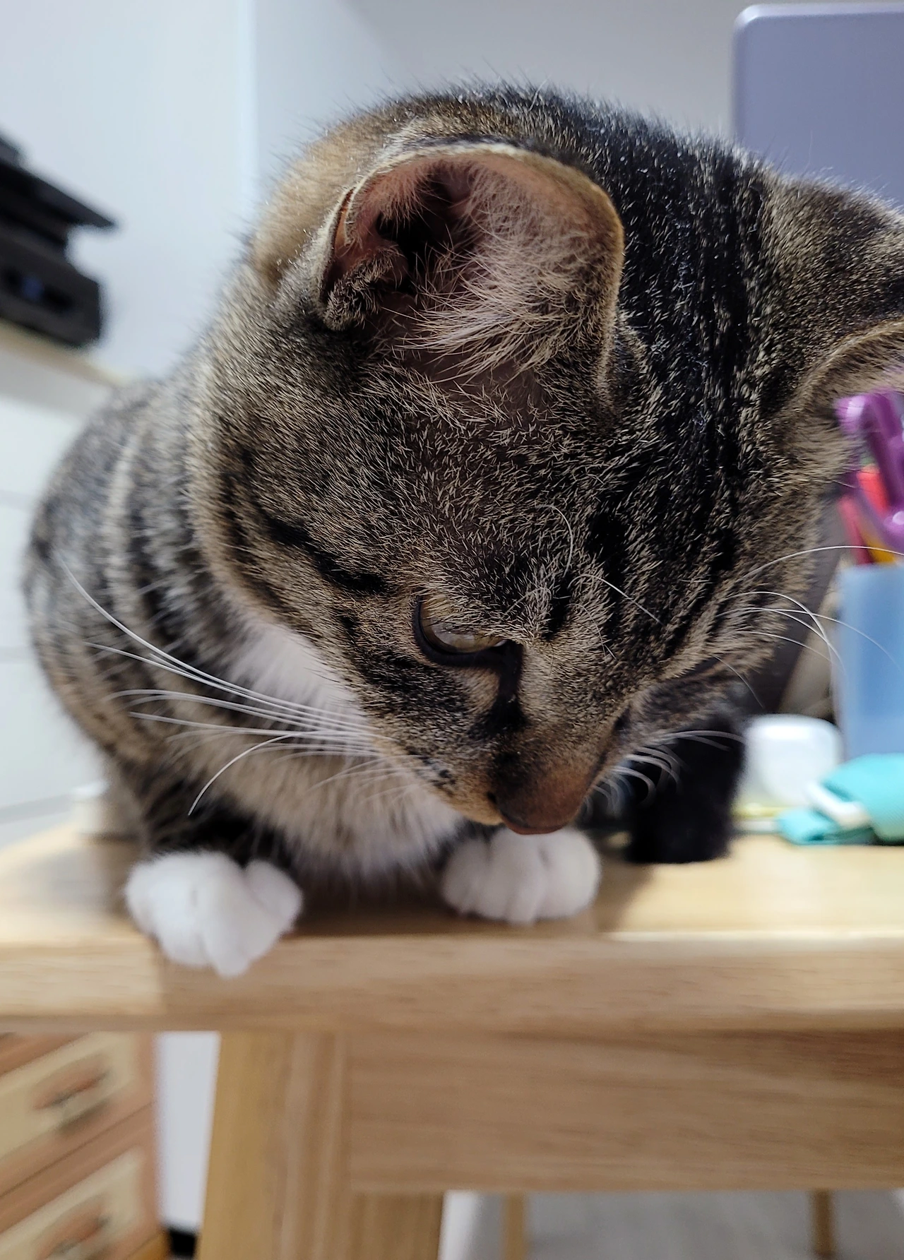 책상 위에 올라가서 가만히 아래를 쳐다본다.