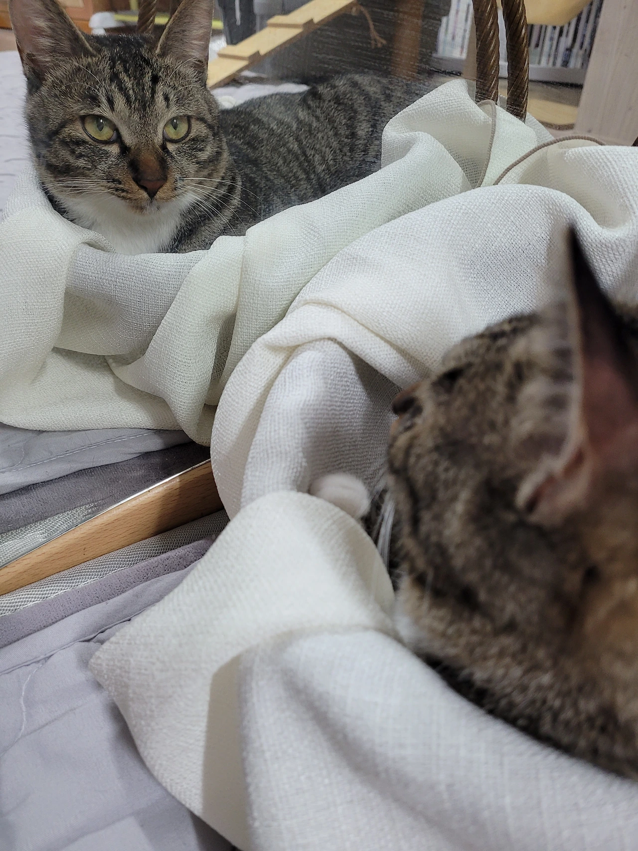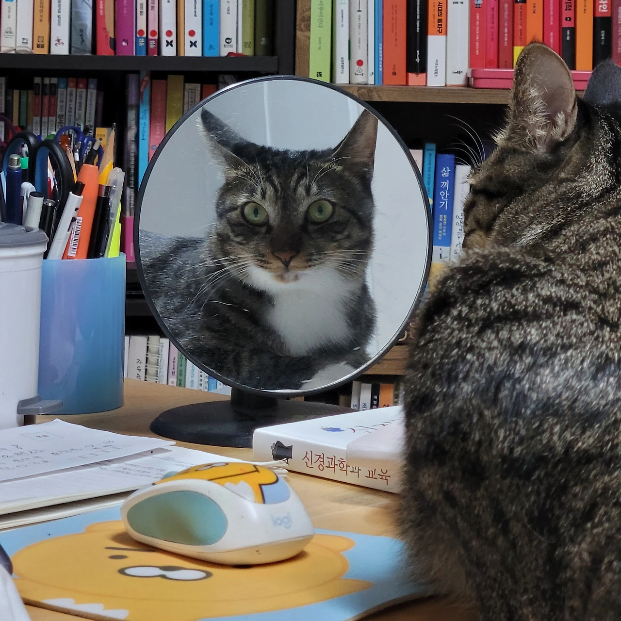 이랬는데 이젠 거울 속 고양이가 자신인 걸 알아요.