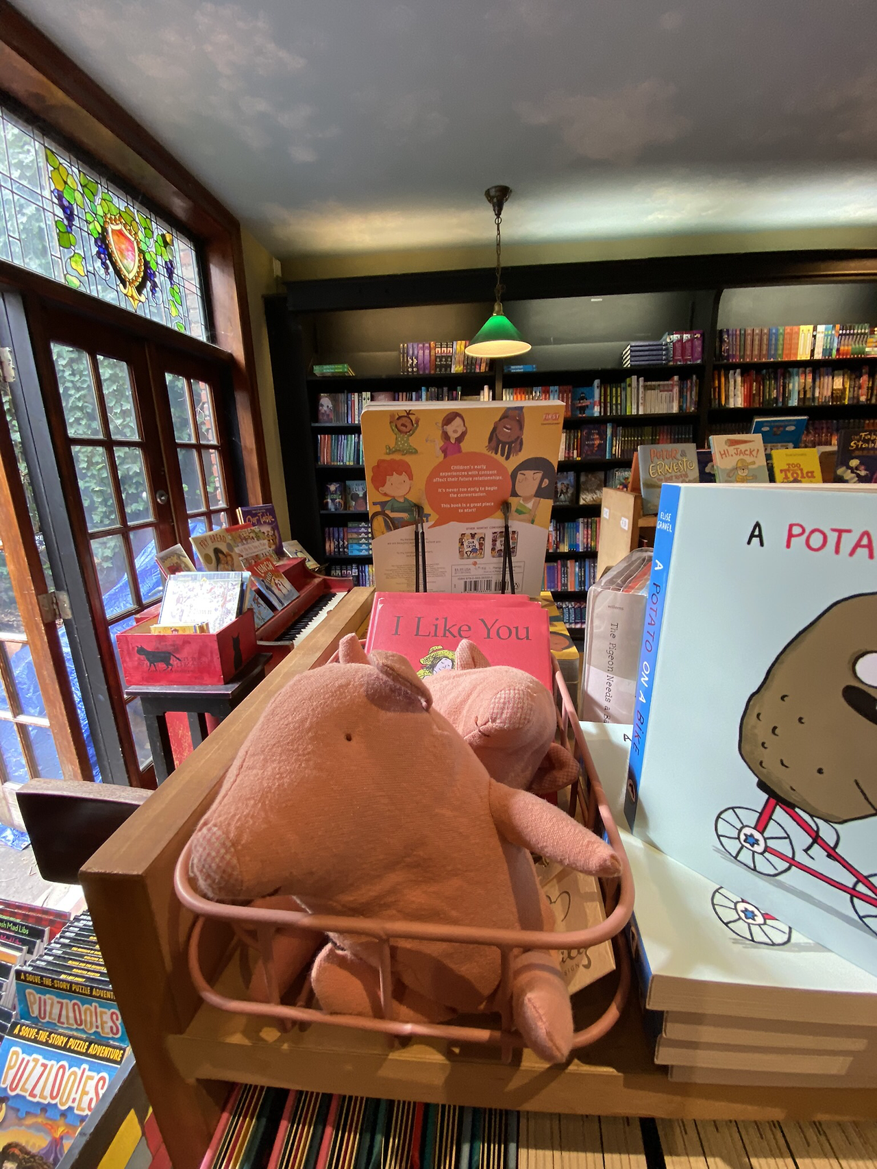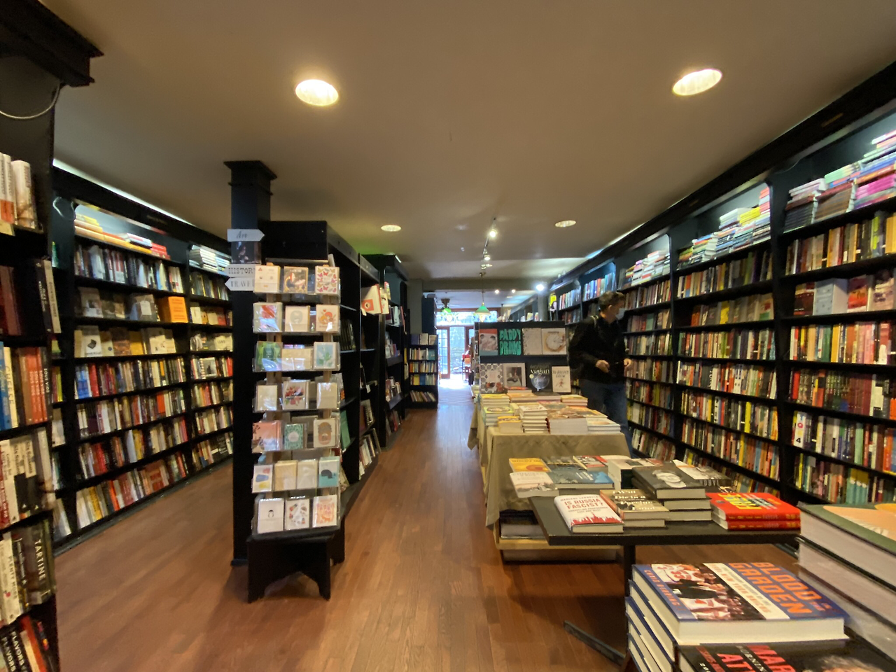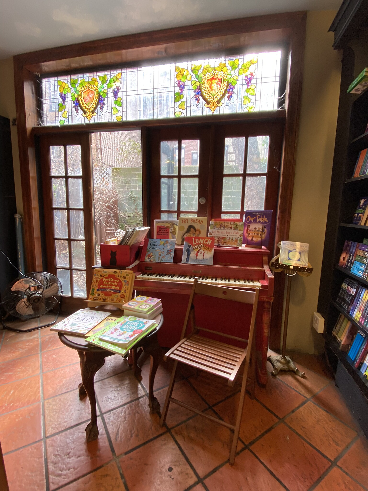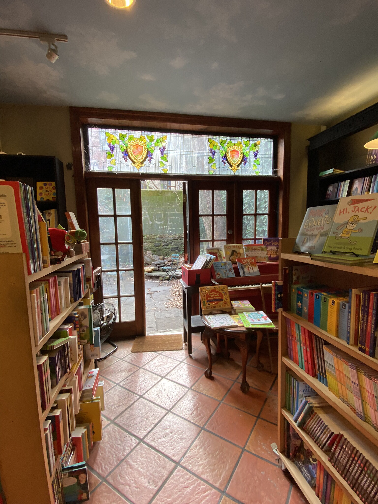 문을 열고 들어가면 예의 많은 책장의 보통 서점인데, 복도를 따라 안쪽으로 들어가면, 뒷마당으로 연결되어 있고, 뒷마당으로 나갈 수 있게 문도 열어 놓았다. 뒷마당으로 나가는 문 옆에는 작은 피아노도 있고, 뒷마당에는 작은 탁자뿐 아니라, 작은 연못도 있다. 연못속에 작은 거북이가 산다고 소개되어 있는데 확인은 못했다. 고양이도 한마리 있다고 했는데, 내가 갔을 때는 보이지 않았다. 자신들의 새 책 소개 리스트에 굉장한 자부심을 가지고 있는 것 같다.