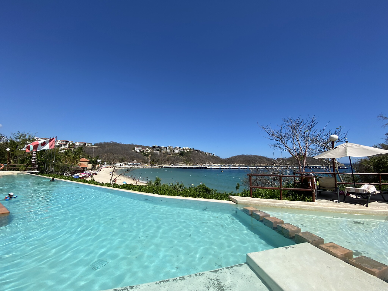 비치 클럽 수영장에서 바라본 맞은 편 언덕의 모습. 각종 숙박시설들이 언덕에 가득하다. 그리고, 위에서 보니, 해변의 전체적인 모습이 더 잘 보인다. 해변에 내려가서 즐기고 싶었는데, 내 물건을 놔 둔 선베드로 웬 젊은이 무리들이 와서 자기들 배낭을 내려놓고 앉으려고 하고 사진 찍으며 근처에서 어슬렁거리길래, 수영장으로 올라왔다. 작년에 남프랑스의 해변 레스토랑에서 선베드에 놔둔 크로스가방에서 지갑만 없어지는 일을 겪었던 터라, 신경이 쓰여서 바로 내 물건을 옮겼다. 잘 사는 나라든 그렇지 않은 나라든 관광지에서는 항상 조심할 일이다.