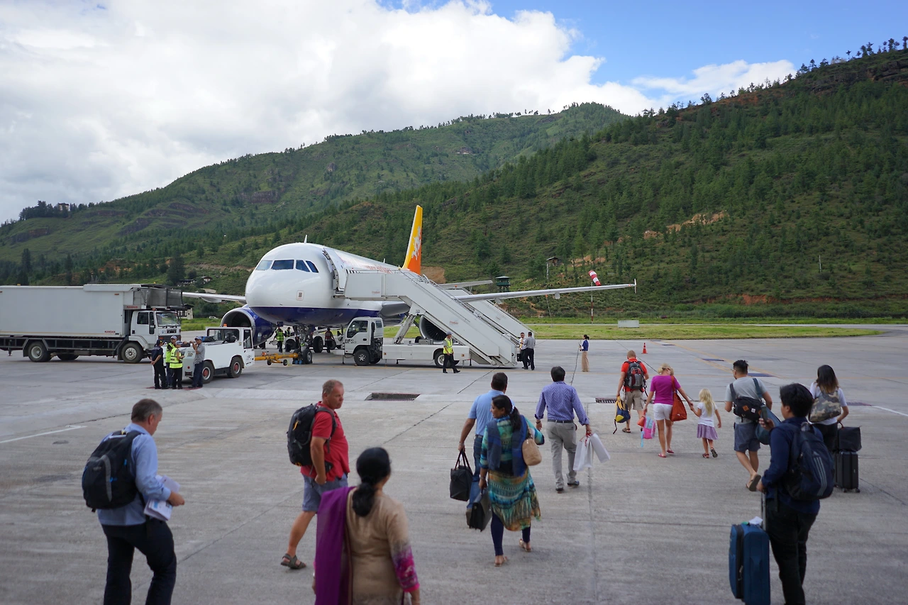부탄에서 출국하기는 난생처음이라 좀 서둘렀는데 너무 일찍 도착했다. 심지어 비행기도 지연돼서 한참을 기다렸다. 나는 혹시 영어로 나오는 방송을 못 들어서 비행기를 놓친 게 아닌가 싶어 몇 차례나 승무원에게 시간을 확인했다. 책을 읽다 시계를 보다 방송이 나오면 귀를 쫑긋하다 그렇게 부탄에서의 마지막 몇 시간이 갔다. 부탄에서 한 마지막 선행이라면, 같은 비행기를 타는 태국 남자가 옆에서 불안해하길래 우리 잘못이 아니라고 안심시켜준 것 정도. 얼마 후 노란 꼬리를 단 국영 항공기가 종이비행기처럼 사뿐하게 파로 공항에 내려앉았다. 우리가 타야 할 비행기였다.