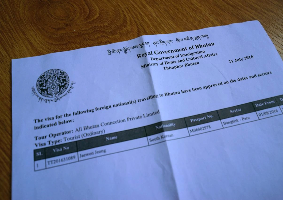 부탄 여행은 좀 특이하다. 많은 사람들이 알다시피, 부탄에 들어가려면 반드시 부탄 현지 에이전트(정식 명칭으로는 Tour Operator)를 통해서 비자를 발급받고 여행 중에도 항상 같이 다녀야 한다. 바꿔 말하면, 한국 여행사는 나한테 부탄 에이전트를 붙여주고 서류 작업 대신해 주는 것 외에 더 하는 일이 없다는 뜻이기도 하다. 다른 나라처럼 직접 가이드를 고용하는 것도 아니고 현지에서 편의를 위해 다른 서비스를 해주는 것도 아니다.