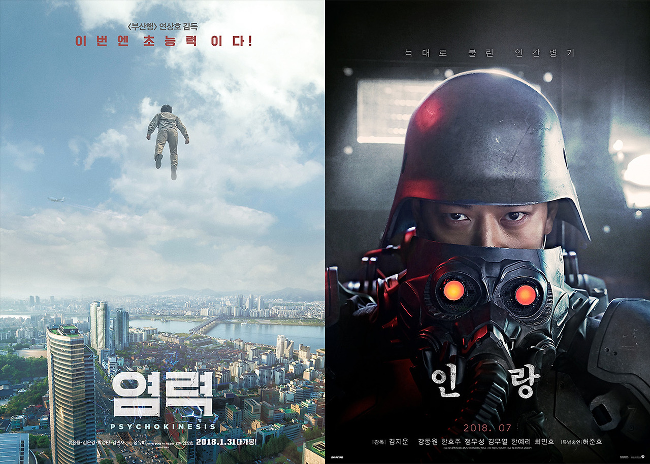 두 영화 다 홍보 포인트가 SF적인 스펙터클이었다. 두 영화의 포스터를 보면 <염력>에는 류승룡이 공중에 떠 있고, <인랑>에는 강동원이 <매드 맥스>를 연상시키는 매카닉 장비를 장착하고 정면을 응시하고 있다. 매카닉 디스토피아가 그려진다. 둘 다 상당한 새로운 볼거리와 스펙터클을 보여주리라는 기대감을 준다.