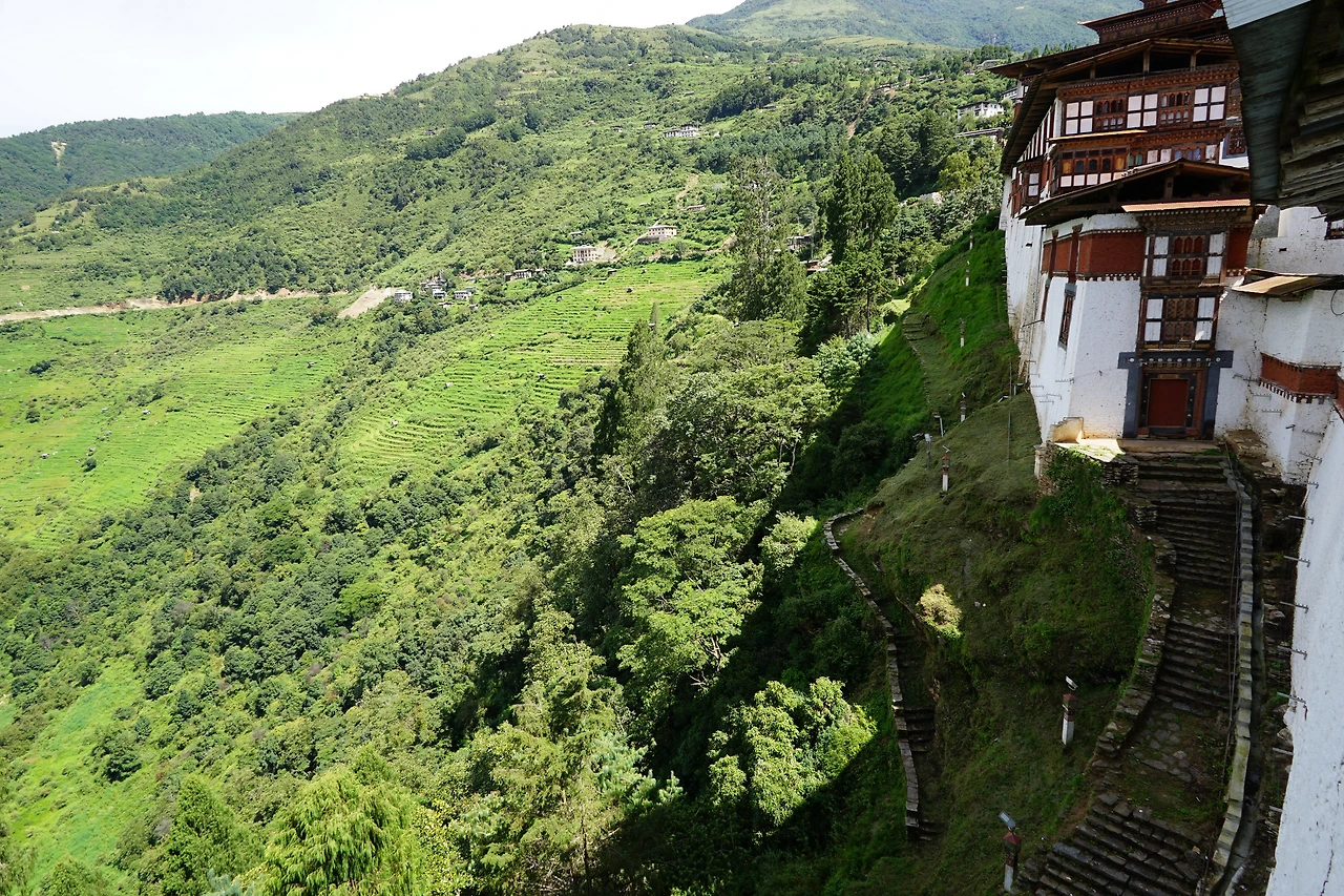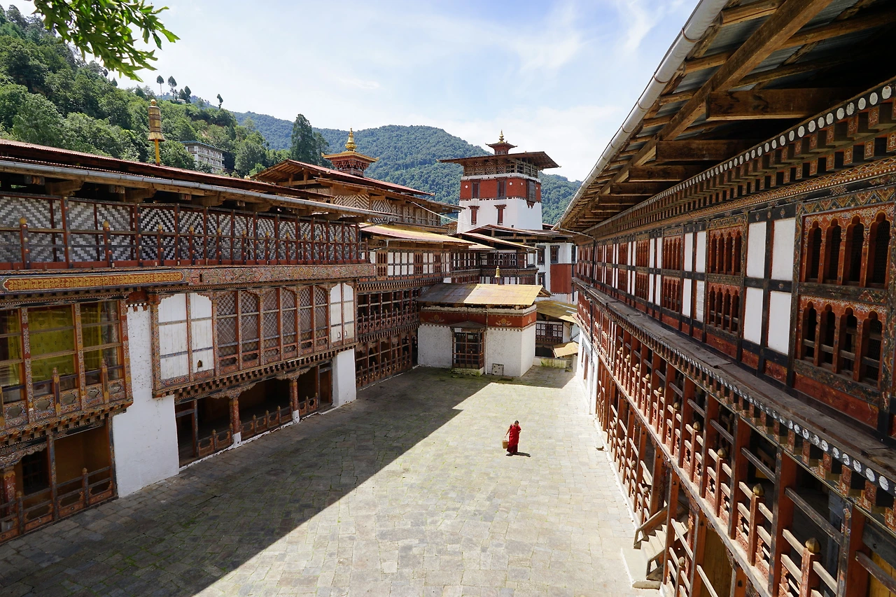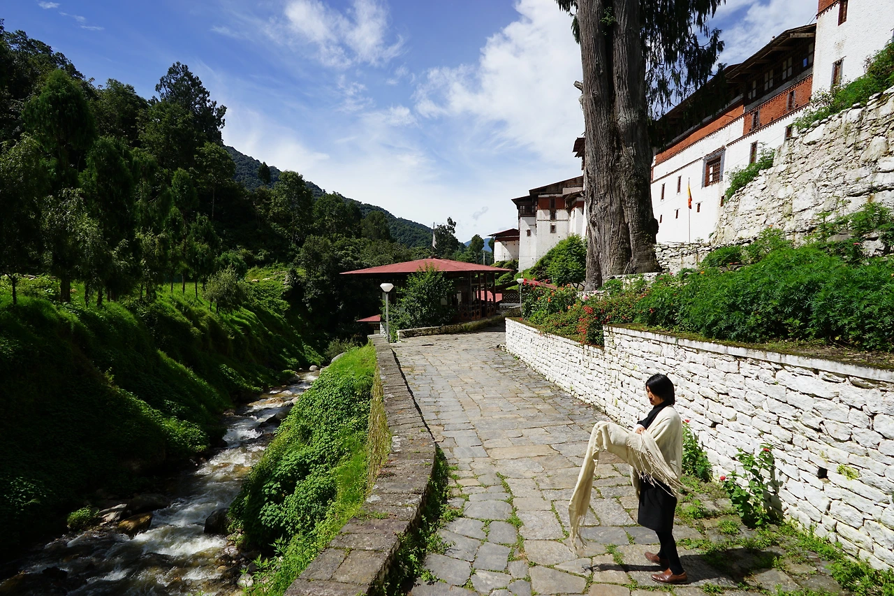 이른 아침 눈을 뜨니 객실 통유리 밖으로 갓 떠오른 해가 깊은 골짜기의 곳곳을 밝게 비추고 있었다. 전날 밤에는 모습을 드러내지 않았던 트롱사 종Trongsa dzong도 그렇게 아슴푸레하게 윤곽을 드러냈다. 내 숙소가 트롱사 종이 위치한 산 중턱의 반대편 자락에 아슬하게 걸쳐있었던 덕에, 나는 누워서도 멀리 트롱사 종을 볼 수 있었다. 구름과 안개에 살짝 가려진 모습이 천계의 건축물인듯 신비로웠다. 침대에 누워 가만히 구름의 흐름을 기다렸다.