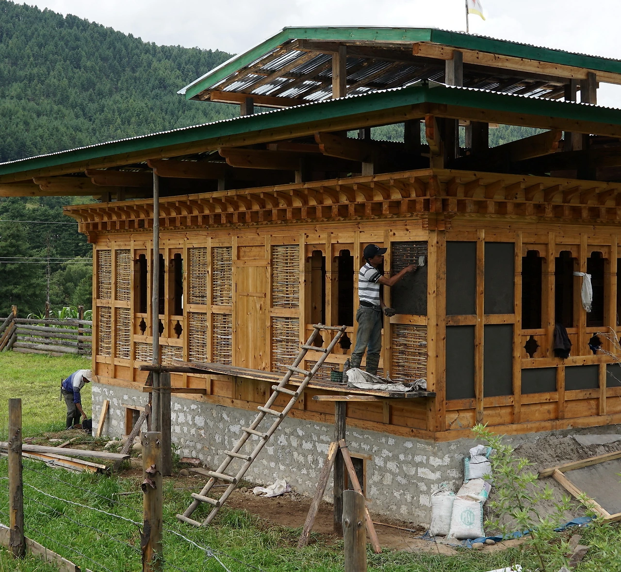 건물 짓는 모습. 건축을 보면 전통을 지키기 위한 부탄 사람들의 고집이 보인다. 부탄에서 지어지는 모든 건축물은 부탄 전통 문양의 창문과 지붕 양식을 따라야 한다.