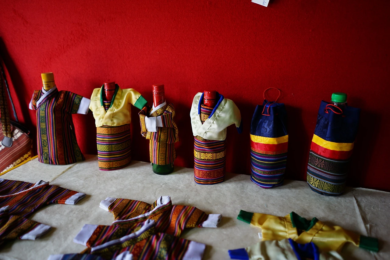 부탄의 한 직물 가게에서 본 아기자기한 옷 모양의 술병 커버
