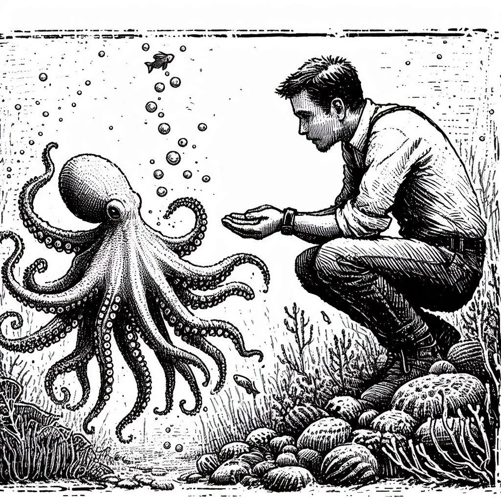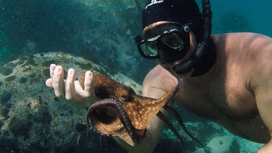 그러다가 작은 문어 한 마리를 만난다. 무리도 없이 혼자 살아가는 문어였다. 그 문어는 생존을 위해 주변의 지형지물을 절묘하게 이용하고, 상어 떼의 습격을 받은 뒤 몸의 한 부분을 포기하기도 한다.