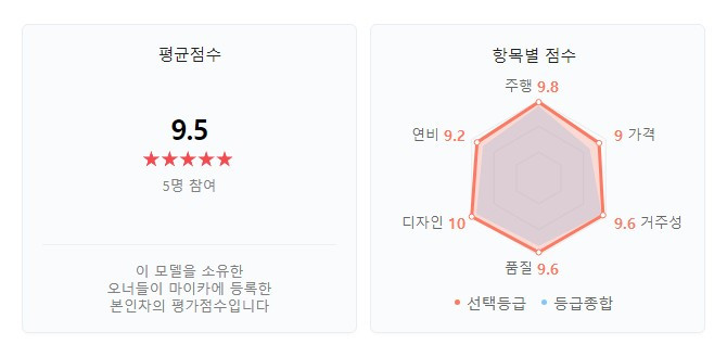 평가에 참여한 오너들 대부분은 높은 점수를 부여하며 만족도를 드러냈다. 그러나 종합점수 5점을 부여한 오너도 있다. susm****님은 “겉에서 보이는 차폭은 넓어 보이는데 운전석이 좁고 운전석, 조수석 의자가 좁아 조금 불편함. 천장 쪽을 손바닥으로 치면 덜컹대는 소리 뭔지 뭔가 마감이 잘 처리되지 않은 느낌”이라고 평가하며 품질에 대한 아쉬움을 언급했다.