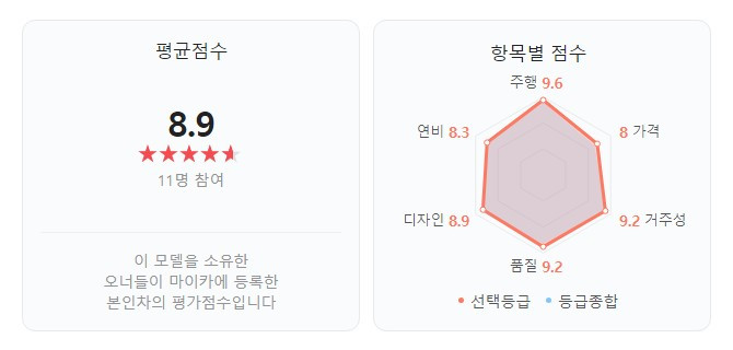 뒤를 이어 9.2점의 높은 점수를 획득한 품질과 거주성 역시 실제 오너들의 호평은 이어진다. 거주성에서 10점을 부여한 kim5****님은 “기대 안 하고 구매했는데 공간이 넓어 대만족”이라고 말했다. kimw****님은 “실내 공간이 생각보다 커서 좋다.”고 평가했다.