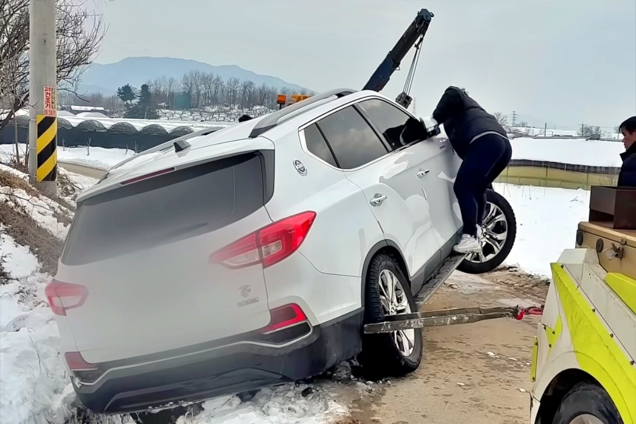 - 눈이 덮인 농로에서 떨어진 렉스턴